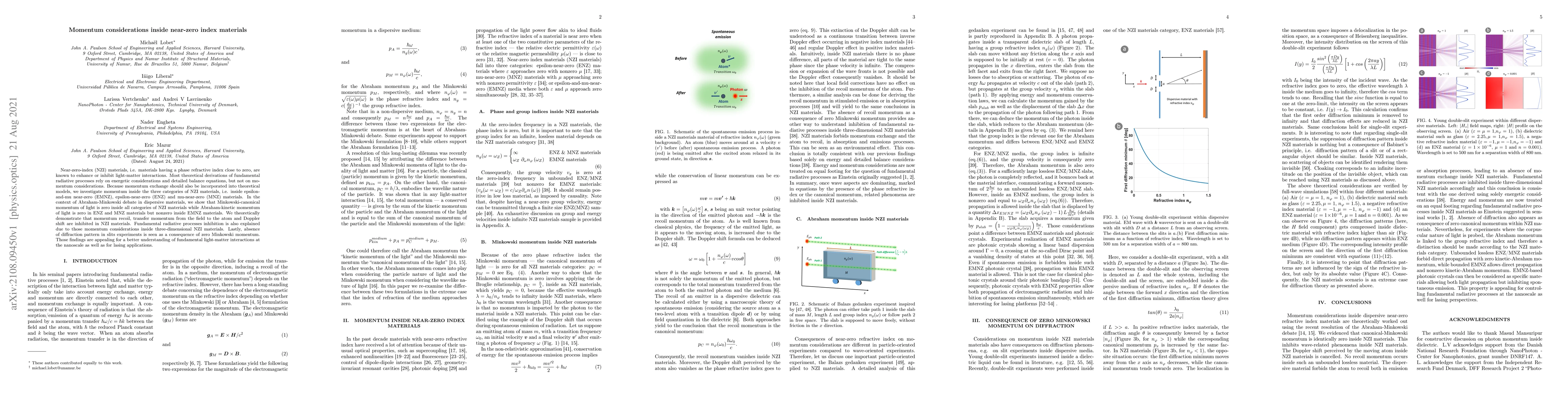 This paper investigates the momentum considerations within near-zero-index materials, revealing that Minkowski-canonical momentum of light is zero across all types, while Abraham-kinetic momentum is zero in epsilon-near-zero and mu-near-zero materials but nonzero in epsilon-and-mu near-zero materials. The study highlights the inhibition of fundamental radiative processes and diffraction patterns due to these momentum dynamics.