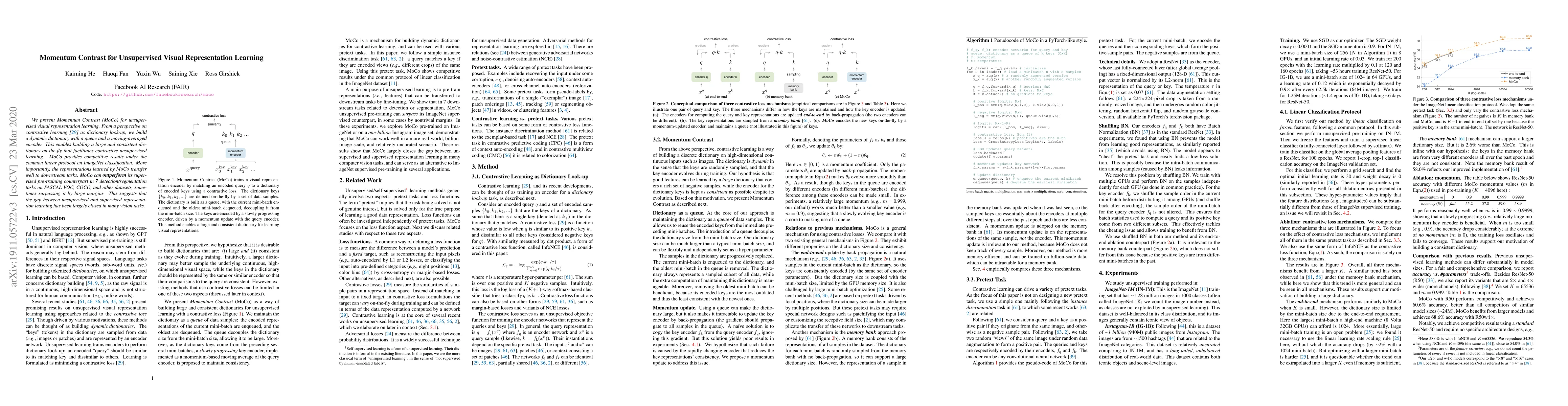 We present Momentum Contrast (MoCo) for unsupervised visual representation learning. From a perspective on contrastive learning as dictionary look-up, we build a dynamic dictionary with a queue and a moving-averaged encoder. This enables building a large and consistent dictionary on-the-fly that facilitates contrastive unsupervised learning. MoCo provides competitive results under the common linear protocol on ImageNet classification. More importantly, the representations learned by MoCo transfer well to downstream tasks. MoCo can outperform its supervised pre-training counterpart in 7 detection/segmentation tasks on PASCAL VOC, COCO, and other datasets, sometimes surpassing it by large margins. This suggests that the gap between unsupervised and supervised representation learning has been largely closed in many vision tasks.