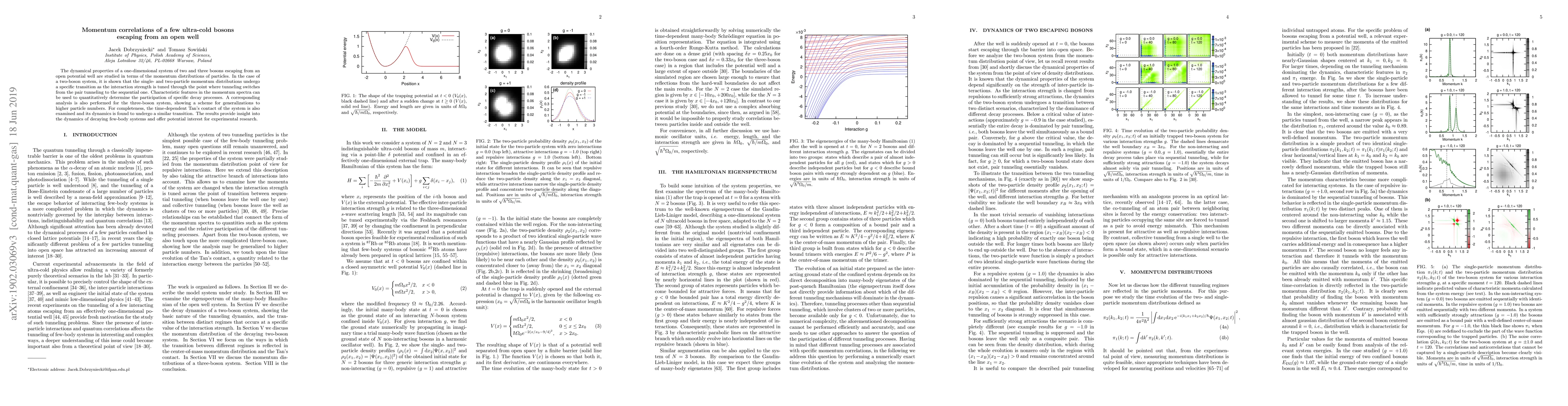The dynamical properties of a one-dimensional system of two and three bosons escaping from an open potential well are studied in terms of the momentum distributions of particles. In the case of a two-boson system, it is shown that the single- and two-particle momentum distributions undergo a specific transition as the interaction strength is tuned through the point where tunneling switches from the pair tunneling to the sequential one. Characteristic features in the momentum spectra can be used to quantitatively determine the participation of specific decay processes. A corresponding analysis is also performed for the three-boson system, showing a scheme for generalizations to higher particle numbers. For completeness, the time-dependent Tan's contact of the system is also examined and its dynamics is found to undergo a similar transition. The results provide insight into the dynamics of decaying few-body systems and offer potential interest for experimental research.