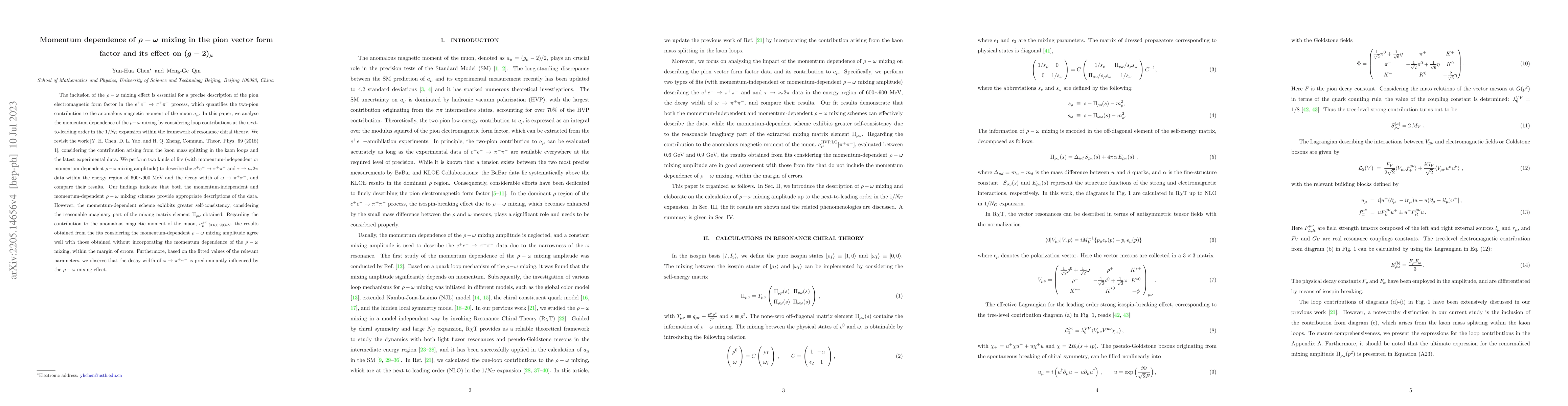 This paper investigates the momentum-dependence of $\rho-\omega$ mixing in the pion vector form factor and its implications for the anomalous magnetic moment of the muon $(g-2)_\mu$. It finds that while both momentum-independent and momentum-dependent mixing schemes fit the data, the momentum-dependent scheme shows greater self-consistency and influences the decay width of $\omega \rightarrow \pi^+\pi^-$ significantly.