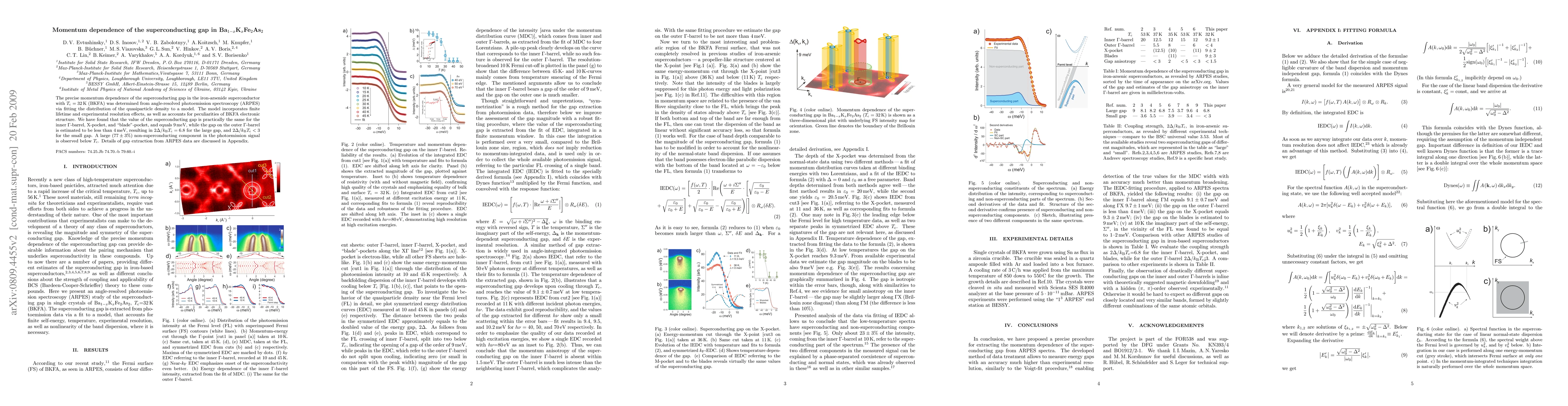 This research determines the momentum dependence of the superconducting gap in Ba1-xKxFe2As2 using angle-resolved photoemission spectroscopy (ARPES). Key findings include a uniform superconducting gap of 9 meV on inner pockets and a smaller gap of less than 4 meV on outer pockets, with a large non-superconducting component observed below Tc.