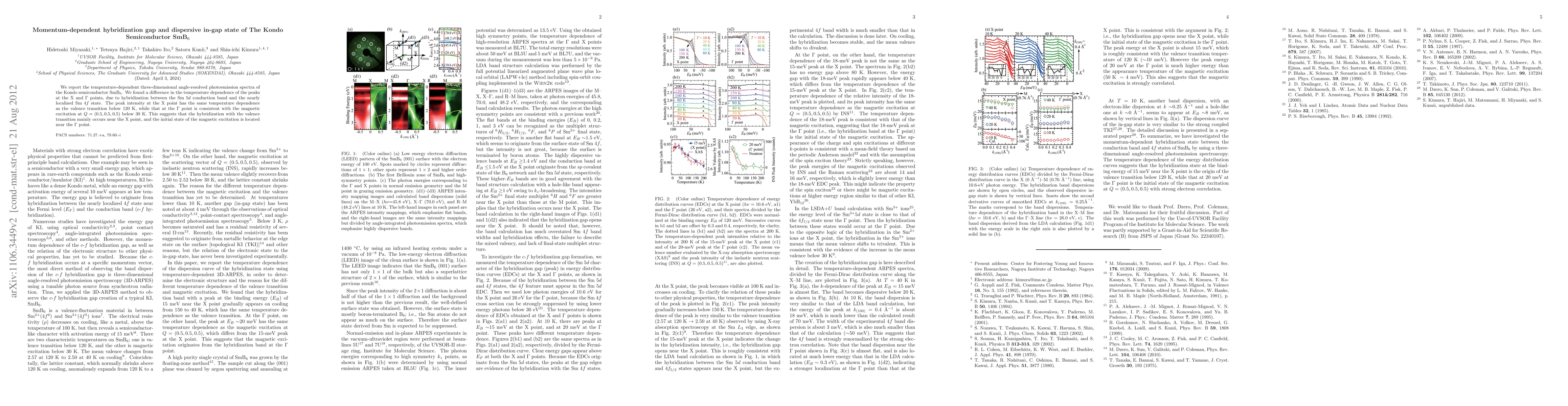 This study reveals temperature-dependent differences in peaks at X and Γ points in SmB$_6$ via angle-resolved photoemission, indicating distinct hybridization behaviors linked to valence transitions and magnetic excitations. The findings suggest hybridization primarily occurs at the X point, while the Γ point relates to magnetic excitations.