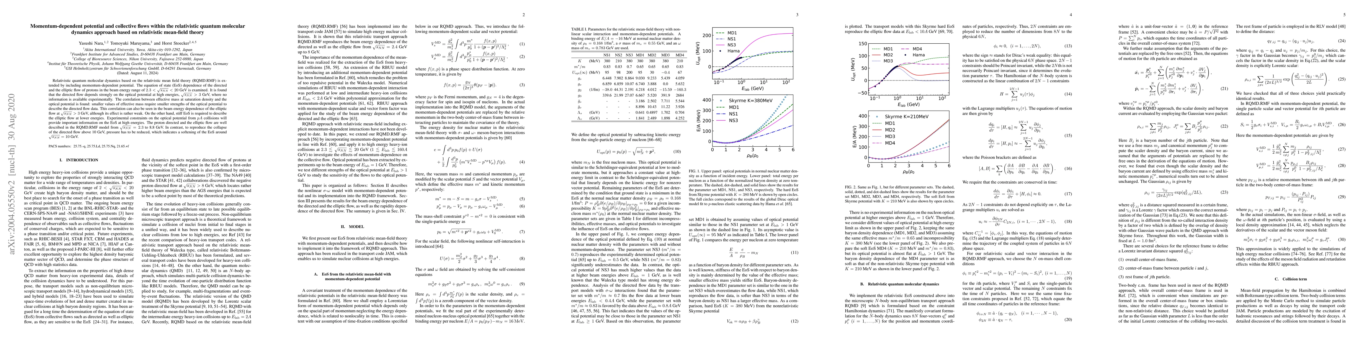 Relativistic quantum molecular dynamics based on the relativistic mean field theory (RQMD.RMF) is extended by including momentum-dependent potential. The equation of state (EoS) dependence of the directed and the elliptic flow of protons in the beam energy range of $2.3 < \sqrt{s_{NN}}< 20$ GeV is examined. It is found that the directed flow depends strongly on the optical potential at high energies,$\sqrt{s_{NN}} > 3 $ GeV, where no information is available experimentally. The correlation between effective mass at saturation density and the optical potential is found: smaller values of effective mass require smaller strengths of the optical potential to describe the directed flow data.This correlation can also be seen in the beam energy dependence of the elliptic flow at $\sqrt{s_{NN}}>3$ GeV, although its effect is rather weak. On the other hand, stiff EoS is required to describe the elliptic flow at lower energies.Experimental constraints on the optical potential from $pA$ collisions will provide important information on the EoS at high energies.The proton directed and the elliptic flow are well described in the RQMD.RMF model from $\sqrt{s_{NN}}=2.3$ to 8.8 GeV. In contrast,to reproduce the collapse of the directed flow above 10 GeV, pressure has to be reduced, which indicates a softening of the EoS around $\sqrt{s_{NN}} =10 $ GeV.