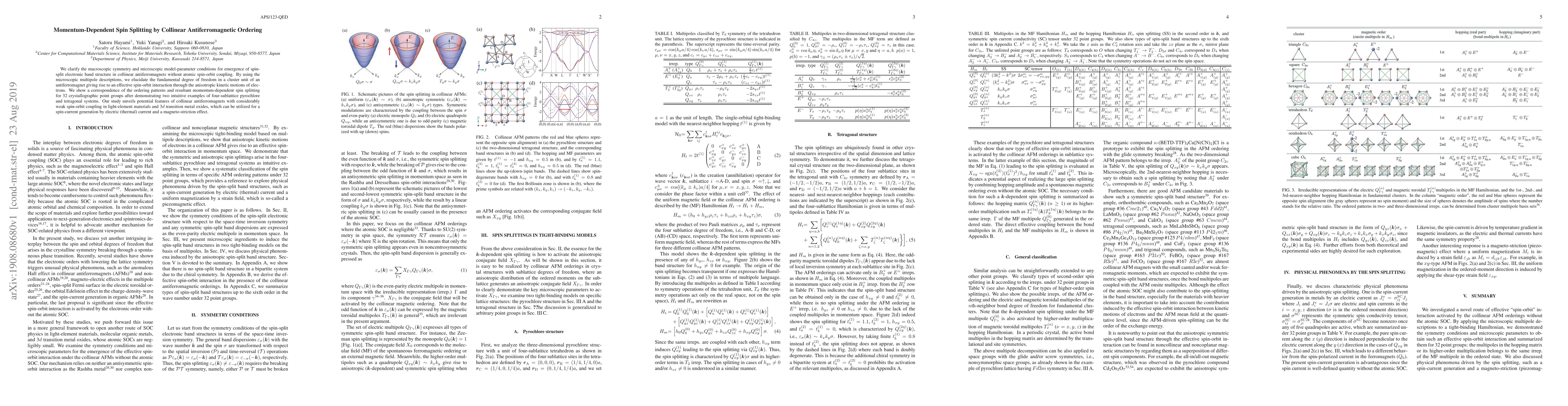 We clarify the macroscopic symmetry and microscopic model-parameter conditions for emergence of spin-split electronic band structure in collinear antiferromagnets without atomic spin-orbit coupling. By using the microscopic multipole descriptions, we elucidate the fundamental degree of freedom in a cluster unit of an antiferromagnet giving rise to an effective spin-orbit interaction through the anisotropic kinetic motions of electrons. We show a correspondence of the ordering patterns and resultant momentum-dependent spin splitting for 32 crystallographic point groups after demonstrating two intuitive examples of four-sublattice pyrochlore and tetragonal systems. Our study unveils potential features of collinear antiferromagnets with considerably weak spin-orbit coupling in light-element materials and 3$d$ transition metal oxides, which can be utilized for a spin-current generation by electric (thermal) current and a magneto-striction effect.