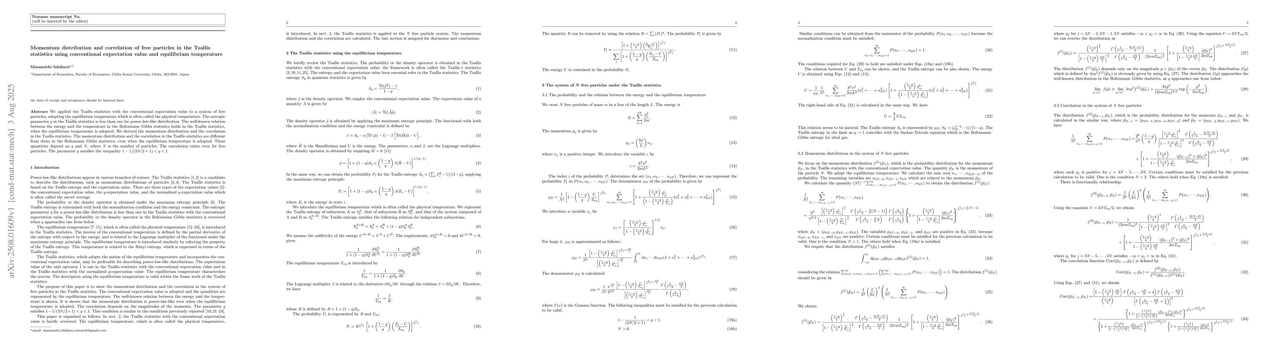 We applied the Tsallis statistics with the conventional expectation value to a system of free particles, adopting the equilibrium temperature which is often called the physical temperature. The entropic parameter $q$ in the Tsallis statistics is less than one for power-law-like distribution. The well-known relation between the energy and the temperature in the Boltzmann--Gibbs statistics holds in the Tsallis statistics, when the equilibrium temperature is adopted. We derived the momentum distribution and the correlation in the Tsallis statistics. The momentum distribution and the correlation in the Tsallis statistics are different from those in the Boltzmann--Gibbs statistics, even when the equilibrium temperature is adopted. These quantities depend on $q$ and $N$, where $N$ is the number of particles. The correlation exists even for free particles. The parameter $q$ satisfies the inequality $1-1/(3N/2+1) < q < 1$.