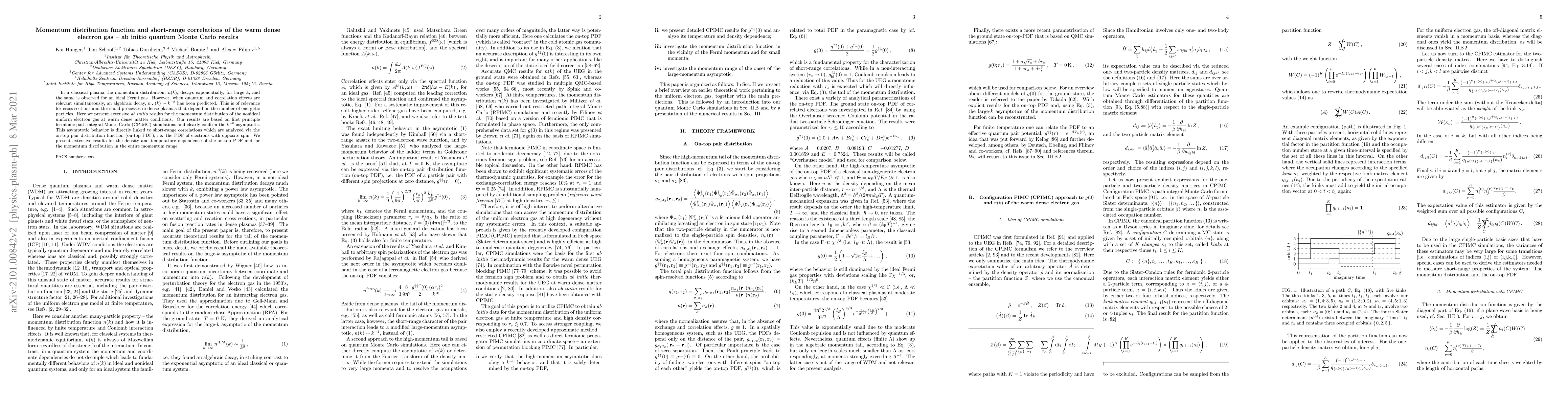 In a classical plasma the momentum distribution, $n(k)$, decays exponentially, for large $k$, and the same is observed for an ideal Fermi gas. However, when quantum and correlation effects are relevant simultaneously, an algebraic decay, $n_\infty(k)\sim k^{-8}$ has been predicted. This is of relevance for cross sections and threshold processes in dense plasmas that depend on the number of energetic particles. Here we present extensive \textit{ab initio} results for the momentum distribution of the nonideal uniform electron gas at warm dense matter conditions. Our results are based on first principle fermionic path integral Monte Carlo (CPIMC) simulations and clearly confirm the $k^{-8}$ asymptotic. This asymptotic behavior is directly linked to short-range correlations which are analyzed via the on-top pair distribution function (on-top PDF), i.e. the PDF of electrons with opposite spin. We present extensive results for the density and temperature dependence of the on-top PDF and for the momentum distribution in the entire momentum range.