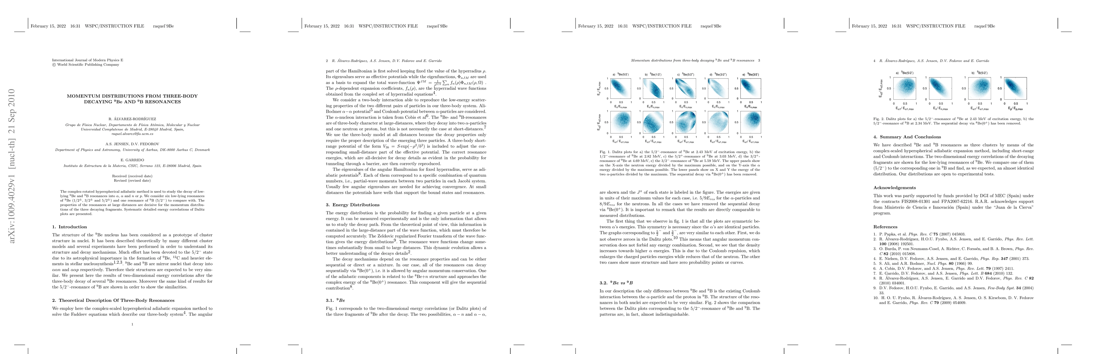 The complex-rotated hyperspherical adiabatic method is used to study the decay of low-lying $^9$Be and $^9$B resonances into $\alpha$, $\alpha$ and $n$ or $p$. We consider six low-lying resonances of $^9$Be ($1/2^\pm$, $3/2^\pm$ and $5/2^\pm$) and one resonance of $^9$B ($5/2^-$) to compare with. The properties of the resonances at large distances are decisive for the momentum distributions of the three decaying fragments. Systematic detailed energy correlations of Dalitz plots are presented.
