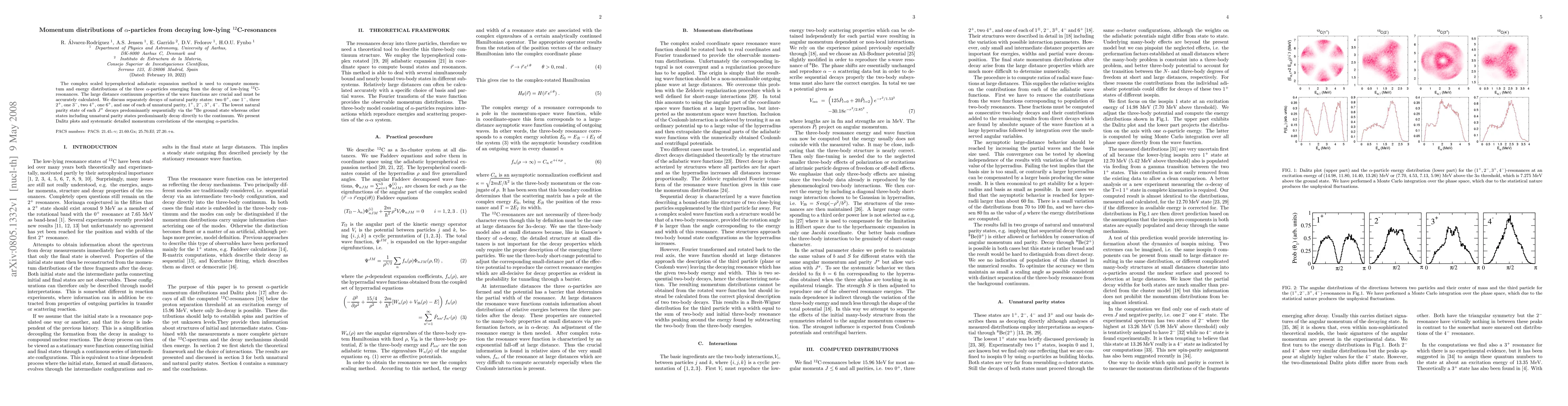 The complex scaled hyperspherical adiabatic expansion method is used to compute momentum and energy distributions of the three $\alpha$-particles emerging from the decay of low-lying $^{12}$C-resonances. The large distance continuum properties of the wave functions are crucial and must be accurately calculated. We discuss separately decays of natural parity states: two $0^+$, one $1^{-}$, three $2^+$, one $3^-$, two $4^+$, one $6^+$, and one of each of unnatural parity, $1^{+}$, $2^-$, $3^+$, $4^-$. The lowest natural parity state of each $J^{\pi}$ decays predominantly sequentially via the $^{8}$Be ground state whereas other states including unnatural parity states predominantly decay directly to the continuum. We present Dalitz plots and systematic detailed momentum correlations of the emerging $\alpha$-particles.