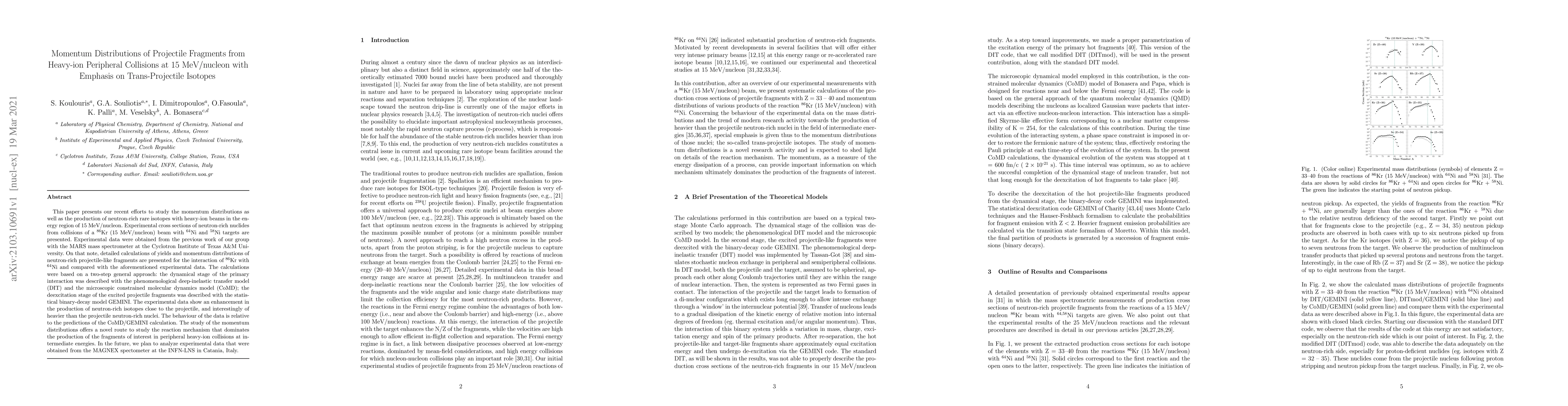 This paper presents our recent efforts to study the momentum distributions as well as the production of neutron-rich rare isotopes with heavy-ion beams in the energy region of 15 MeV/nucleon. Experimental cross sections of neutron-rich nuclides from collisions of a 86 Kr (15 MeV/nucleon) beam with 64 Ni and 58 Ni targets are presented. Experimental data were obtained from the previous work of our group with the MARS mass spectrometer at the Cyclotron Institute of Texas A&M University. On that note, detailed calculations of yields and momentum distributions of neutron-rich projectile-like fragments are presented for the interaction of 86 Kr with 64 Ni and compared with the aforementioned experimental data. The calculations were based on a two-step general approach: the dynamical stage of the primary interaction was described with the phenomenological deep-inelastic transfer model (DIT) and the microscopic constrained molecular dynamics model (CoMD); the deexcitation stage of the excited projectile fragments was described with the statistical binary-decay model GEMINI. The experimental data show an enhancement in the production of neutron-rich isotopes close to the projectile, and interestingly of heavier than the projectile neutron-rich nuclei. The behaviour of the data is relative to the predictions of the CoMD/GEMINI calculation. The study of the momentum distributions offers a novel route to study the reaction mechanism that dominates the production of the fragments of interest in peripheral heavy-ion collisions at intermediate energies. In the future, we plan to analyze experimental data that were obtained from the MAGNEX spectometer at the INFN-LNS in Catania, Italy.