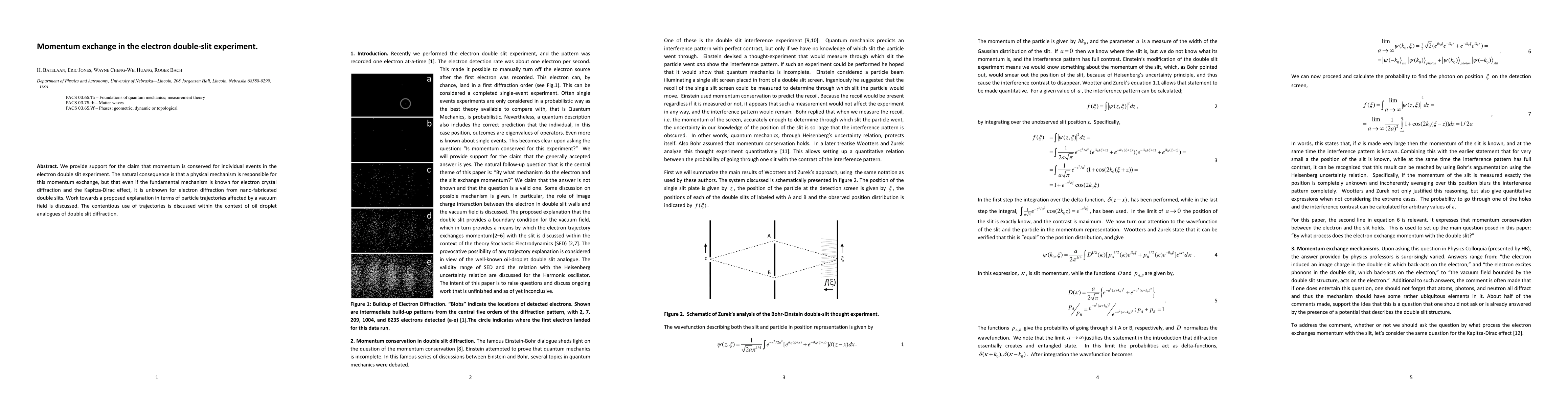 The paper presents a detailed analysis of momentum conservation in electron double-slit experiments, comparing it with established mechanisms like the Kapitza-Dirac effect and proposing a vacuum field-based explanation.