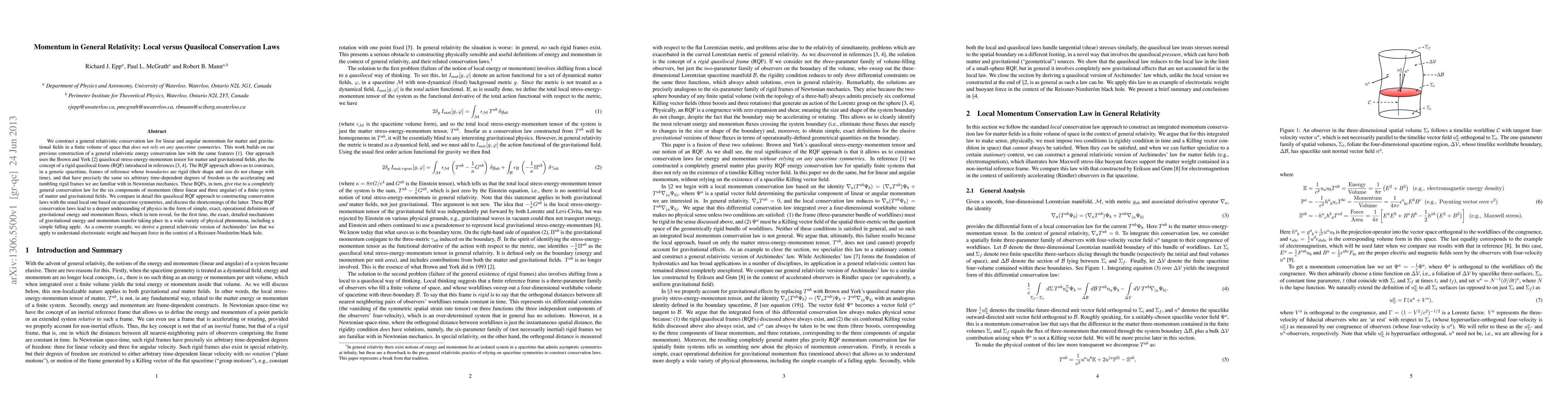 This paper constructs a general relativistic conservation law for linear and angular momentum in a finite volume, using the Brown and York quasilocal stress-energy-momentum tensor and the rigid quasilocal frame (RQF) approach. It contrasts this quasilocal method with traditional local conservation laws based on spacetime symmetries, revealing detailed mechanisms of gravitational energy and momentum transfer.