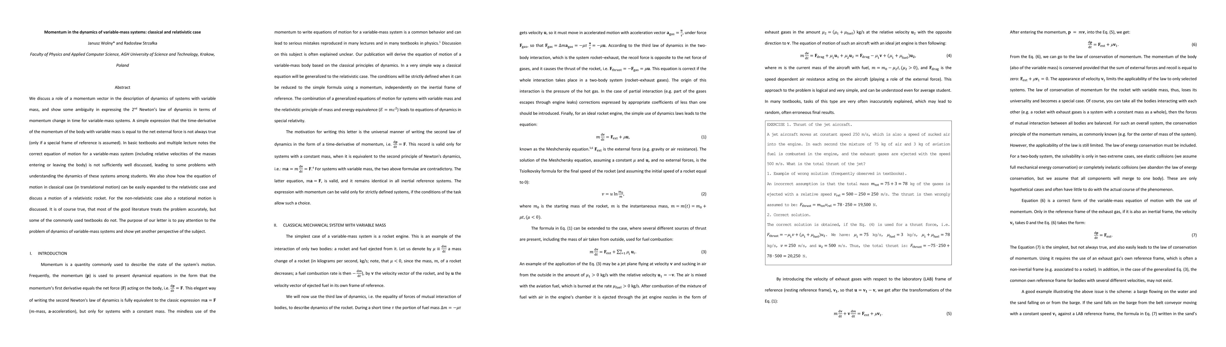 We discuss a role of a momentum vector in the description of dynamics of systems with variable mass, and show some ambiguity in expressing the 2nd Newtonian law of dynamics in terms of momentum change in time for variable-mass systems. A simple expression that the time-derivative of the momentum of the body with variable mass is equal to the net external force is not always true (only if a special frame of reference is assumed). In basic textbooks and multiple lecture notes the correct equation of motion for a variable-mass system (including relative velocities of the masses entering or leaving the body) is not sufficiently well discussed, leading to some problems with understanding the dynamics of these systems among students. We also show how the equation of motion in classical case (in translational motion) can be easily expanded to the relativistic case and discuss a motion of a relativistic rocket. For the non-relativistic case also a rotational motion is discussed. It is of course true, that most of the good literature treats the problem accurately, but some of the commonly used textbooks do not. The purpose of our letter is to pay attention to the problem of dynamics of variable-mass systems and show yet another perspective of the subject.
