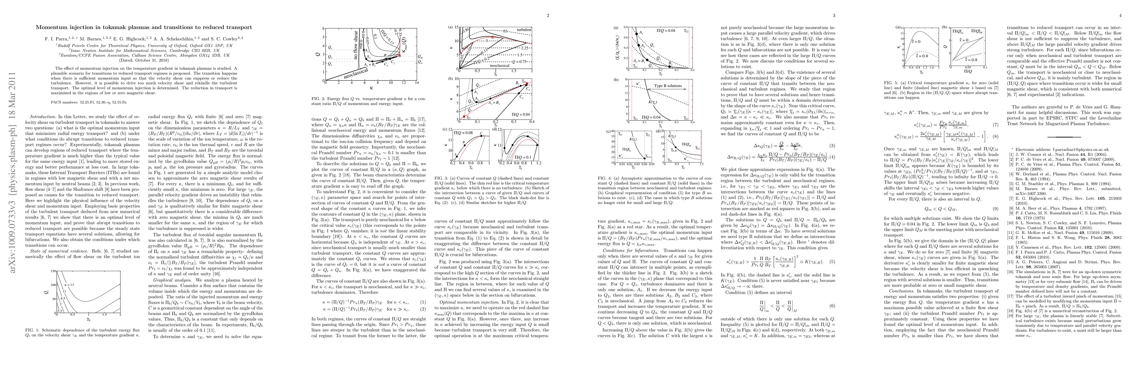 This paper investigates how momentum injection influences temperature gradients in tokamak plasmas, proposing a scenario for transitions to reduced transport regimes when sufficient momentum input suppresses turbulence. The optimal level of momentum injection is identified to maximize transport reduction, particularly in regions with low or zero magnetic shear.