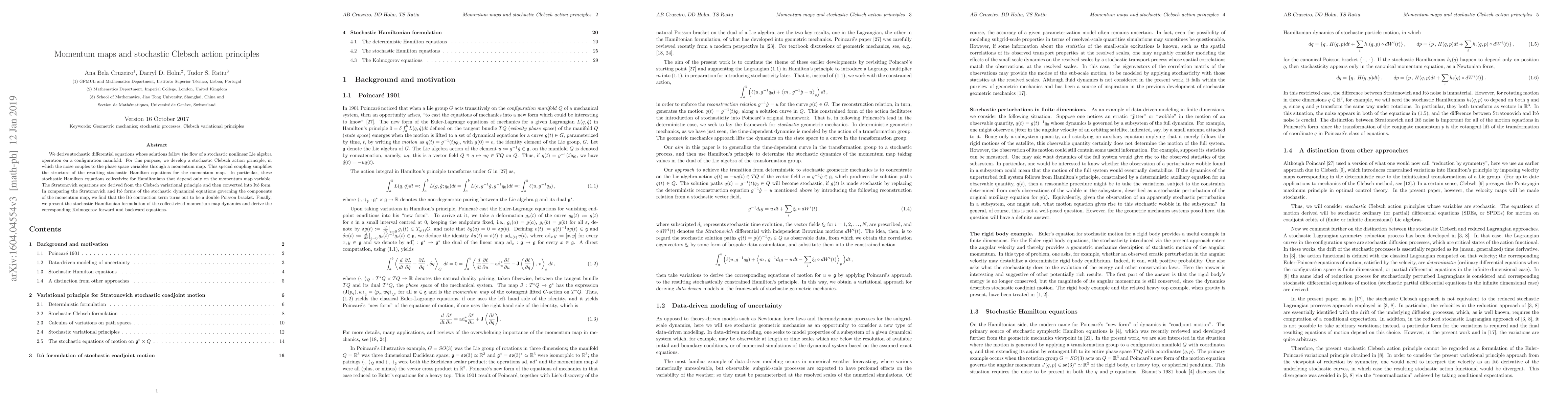 We derive stochastic differential equations whose solutions follow the flow of a stochastic nonlinear Lie algebra operation on a configuration manifold. For this purpose, we develop a stochastic Clebsch action principle, in which the noise couples to the phase space variables through a momentum map. This special coupling simplifies the structure of the resulting stochastic Hamilton equations for the momentum map. In particular, these stochastic Hamilton equations collectivize for Hamiltonians that depend only on the momentum map variable. The Stratonovich equations are derived from the Clebsch variational principle and then converted into It\^o form. In comparing the Stratonovich and It\^o forms of the stochastic dynamical equations governing the components of the momentum map, we find that the It\^o contraction term turns out to be a double Poisson bracket. Finally, we present the stochastic Hamiltonian formulation of the collectivized momentum map dynamics and derive the corresponding Kolmogorov forward and backward equations.