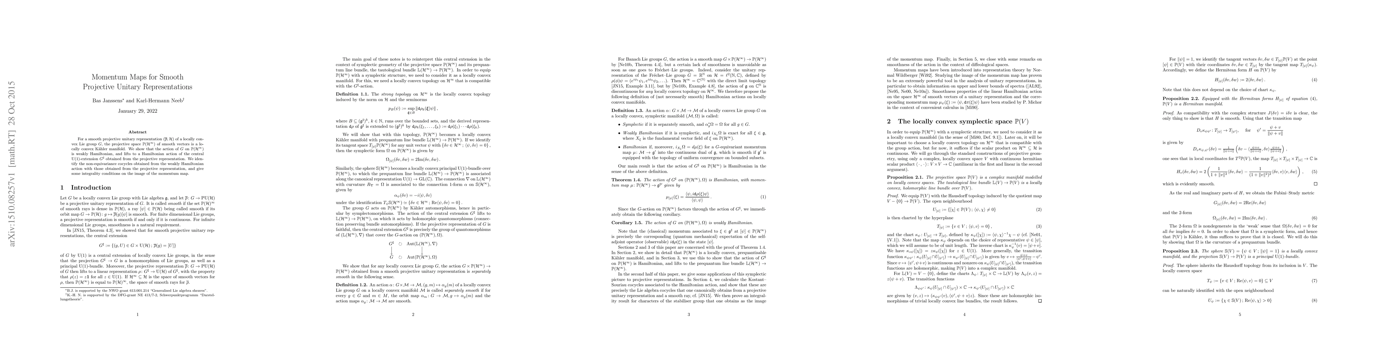 For a smooth projective unitary representation of a locally convex Lie group G, the projective space of smooth vectors is a locally convex Kaehler manifold. We show that the action of G on this space is weakly Hamiltonian, and lifts to a Hamiltonian action of the central U(1)-extension of G obtained from the projective representation. We identify the non-equivariance cocycles obtained from the weakly Hamiltonian action with those obtained from the projective representation, and give some integrality conditions on the image of the momentum map.