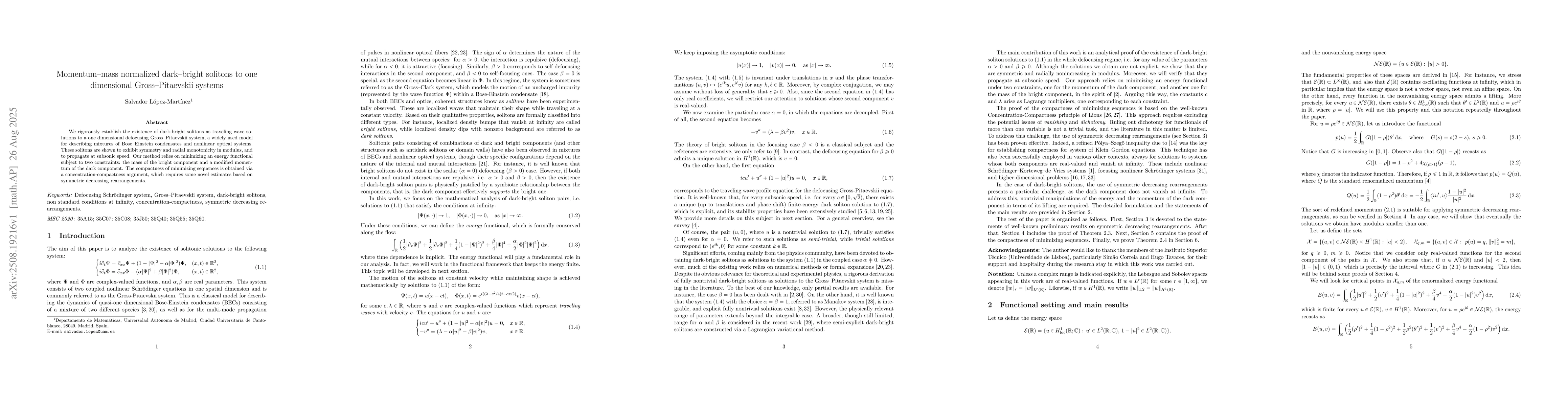 We rigorously establish the existence of dark-bright solitons as traveling wave solutions to a one dimensional defocusing Gross-Pitaevskii system, a widely used model for describing mixtures of Bose-Einstein condensates and nonlinear optical systems. These solitons are shown to exhibit symmetry and radial monotonicity in modulus, and to propagate at subsonic speed. Our method relies on minimizing an energy functional subject to two constraints: the mass of the bright component and a modified momentum of the dark component. The compactness of minimizing sequences is obtained via a concentration-compactness argument, which requires some novel estimates based on symmetric decreasing rearrangements.