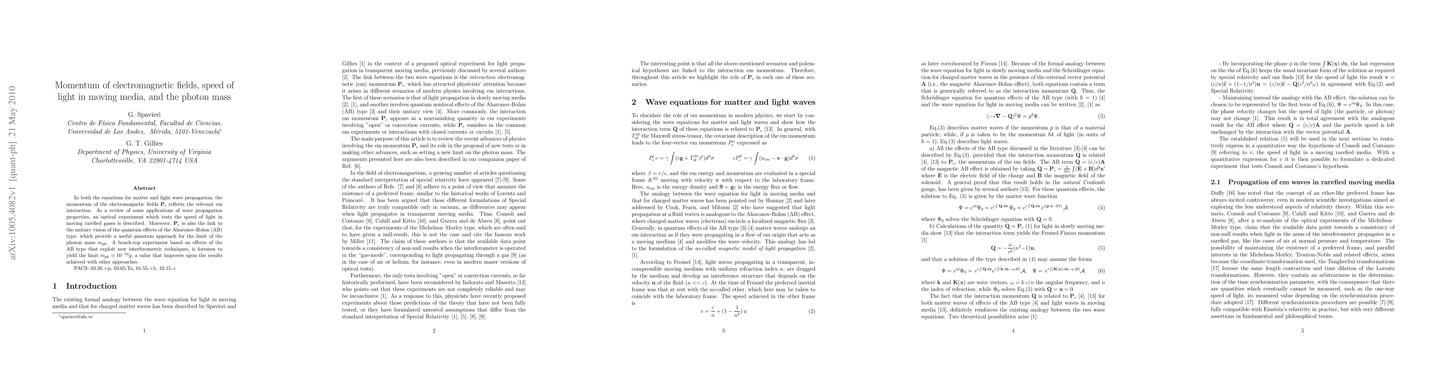 In both the equations for matter and light wave propagation, the momentum of the electromagnetic fields Pe reflects the relevant em interaction. As a review of some applications of wave propagation properties, an optical experiment which tests the speed of light in moving rarefied gases is described. Moreover, Pe is also the link to the unitary vision of the quantum effects of the Aharonov-Bohm (AB) type, which provide a useful quantum approach for the limit of the photon mass mph. A bench-top experiment based on effects of the AB type that exploit new interferometric techniques, is foreseen to yield the limit mph = 10^-54 g, a value that improves upon the results achieved with other approaches.