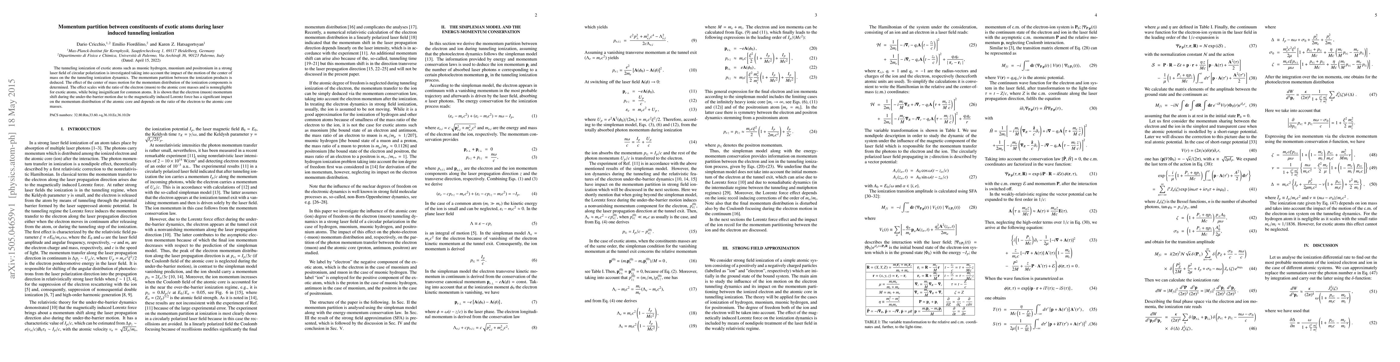 This paper investigates the tunneling ionization dynamics of exotic atoms under strong laser fields, focusing on the momentum partition between ionization products. It finds that the center of mass motion significantly affects the momentum distribution, especially for exotic atoms, due to the electron (muon) to atomic core mass ratio and the magnetically induced Lorentz force.