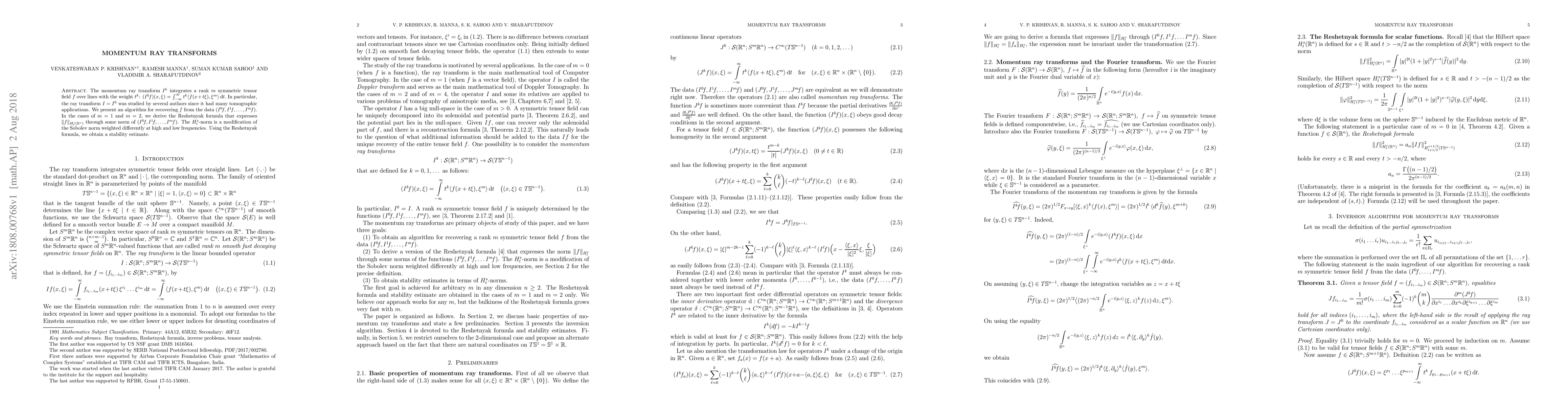 The momentum ray transform $I^k$ integrates a rank $m$ symmetric tensor field $f$ over lines with the weight $t^k$: $ (I^k\!f)(x,\xi)=\int_{-\infty}^\infty t^k\langle f(x+t\xi),\xi^m\rangle\,dt. $ In particular, the ray transform $I=I^0$ was studied by several authors since it had many tomographic applications. We present an algorithm for recovering $f$ from the data $(I^0\!f,I^1\!f,\dots, I^m\!f)$. In the cases of $m=1$ and $m=2$, we derive the Reshetnyak formula that expresses $\|f\|_{H^s_t({\mathbb{R}}^n)}$ through some norm of $(I^0\!f,I^1\!f,\dots, I^m\!f)$. The $H^{s}_{t}$-norm is a modification of the Sobolev norm weighted differently at high and low frequencies. Using the Reshetnyak formula, we obtain a stability estimate.