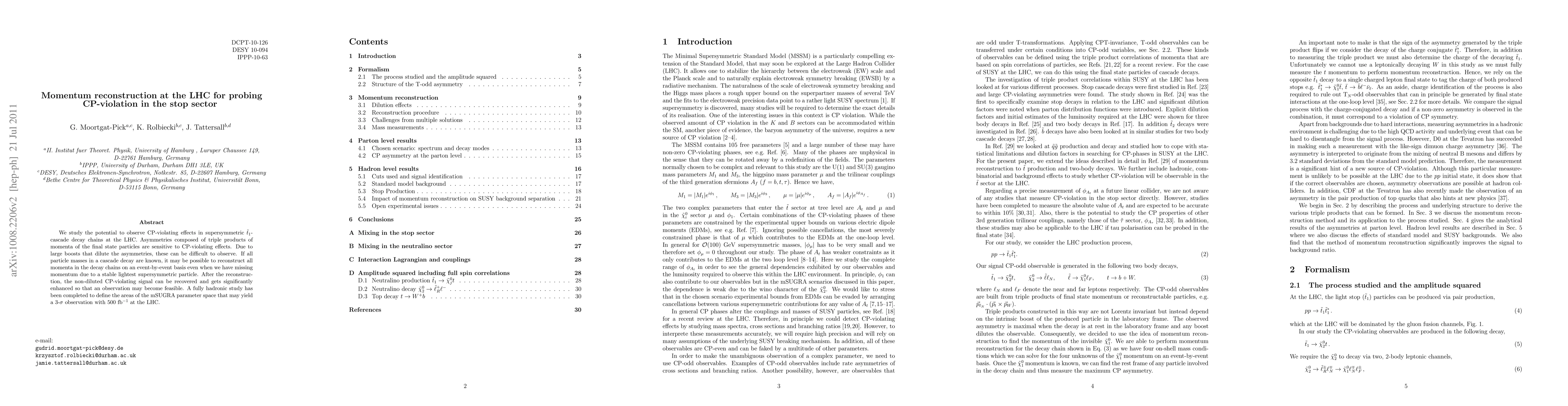 We study the potential to observe CP-violating effects in SUSY stop cascade decay chains at the LHC. Asymmetries composed by triple products of momenta of the final state particles are sensitive to CP-violating effects. Due to large boosts that dilute the asymmetries, these can be difficult to observe. If all particle masses in a cascade decay are known, it may be possible to reconstruct all momenta in the decay chains on an event-by-event basis even when we have missing momentum due to a stable LSP. After the reconstruction, the non-diluted CP-violating signal can be recovered and gets significantly enhanced so that an observation may become feasible. A fully hadronic study has been completed to define the areas of the mSUGRA parameter space that may yield a 3-sigma observation with 500 fb^(-1) at the LHC.