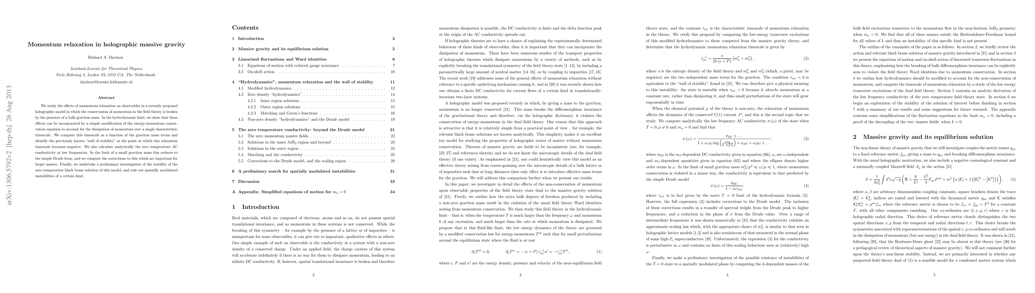 We study the effects of momentum relaxation on observables in a recently proposed holographic model in which the conservation of momentum in the field theory is broken by the presence of a bulk graviton mass. In the hydrodynamic limit, we show that these effects can be incorporated by a simple modification of the energy-momentum conservation equation to account for the dissipation of momentum over a single characteristic timescale. We compute this timescale as a function of the graviton mass terms and identify the previously known "wall of stability" as the point at which this relaxation timescale becomes negative. We also calculate analytically the zero temperature AC conductivity at low frequencies. In the limit of a small graviton mass this reduces to the simple Drude form, and we compute the corrections to this which are important for larger masses. Finally, we undertake a preliminary investigation of the stability of the zero temperature black brane solution of this model, and rule out spatially modulated instabilities of a certain kind.