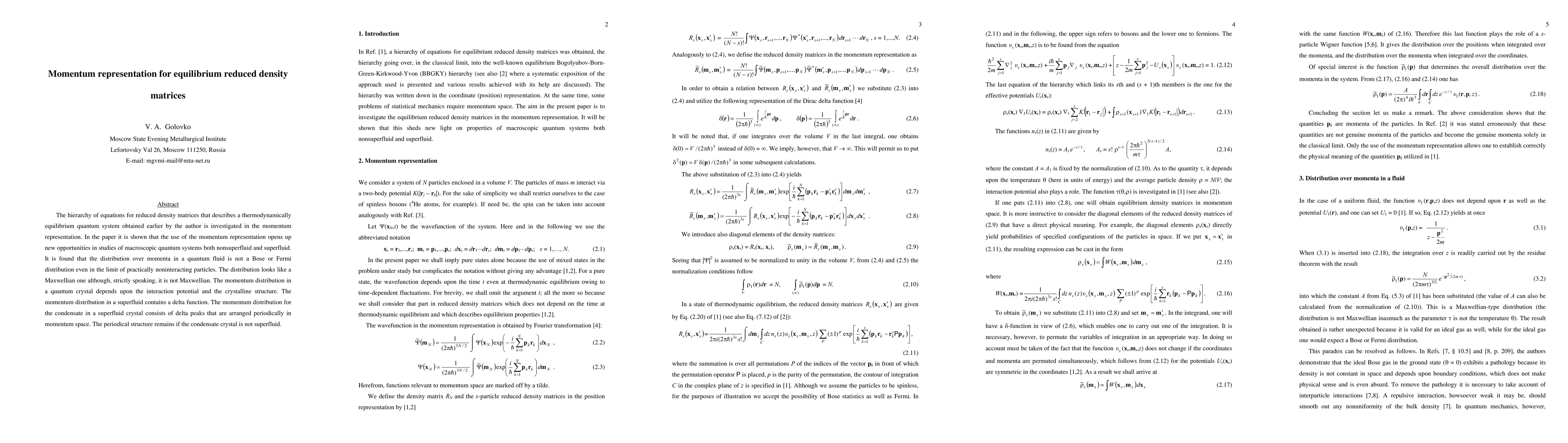 The paper examines equilibrium quantum systems using momentum representation, revealing that momentum distribution in quantum fluids deviates from Bose-Einstein or Fermi-Dirac distributions even for non-interacting particles. It approximates to Maxwellian, while in a quantum crystal, it depends on interaction potential and structure. Superfluids exhibit a momentum distribution with a delta function, and the condensate's distribution shows periodic delta peaks in momentum space, persisting even if the crystal isn't superfluid.