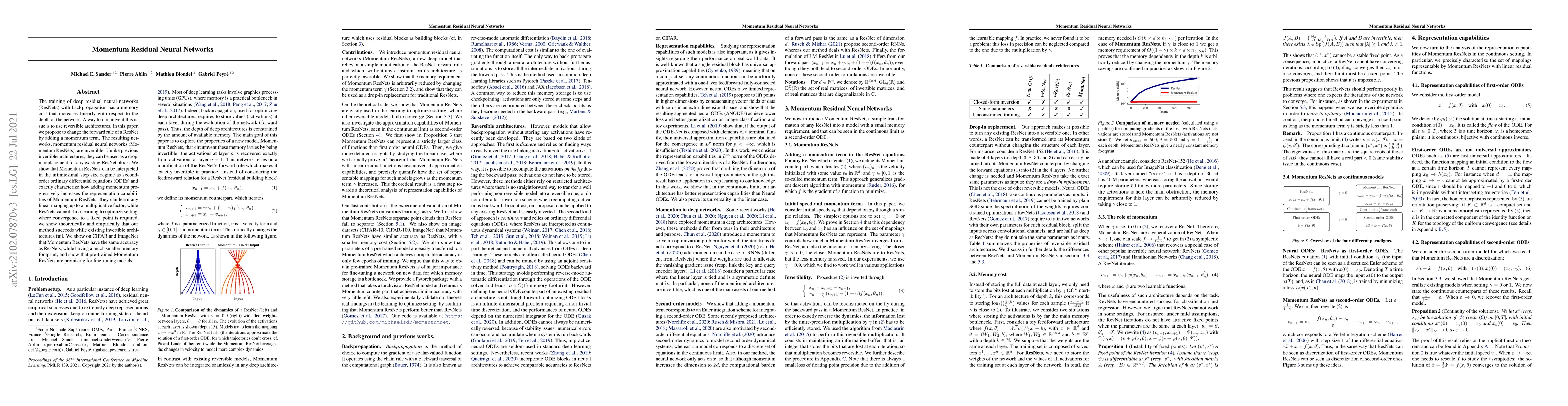 This paper proposes momentum residual neural networks (Momentum ResNets) to address the memory cost issue in deep residual networks by adding a momentum term to the forward rule, making them invertible. The authors demonstrate that Momentum ResNets can learn any linear mapping and outperform existing invertible architectures in learning to optimize settings, while achieving similar accuracy to standard ResNets with a significantly smaller memory footprint.