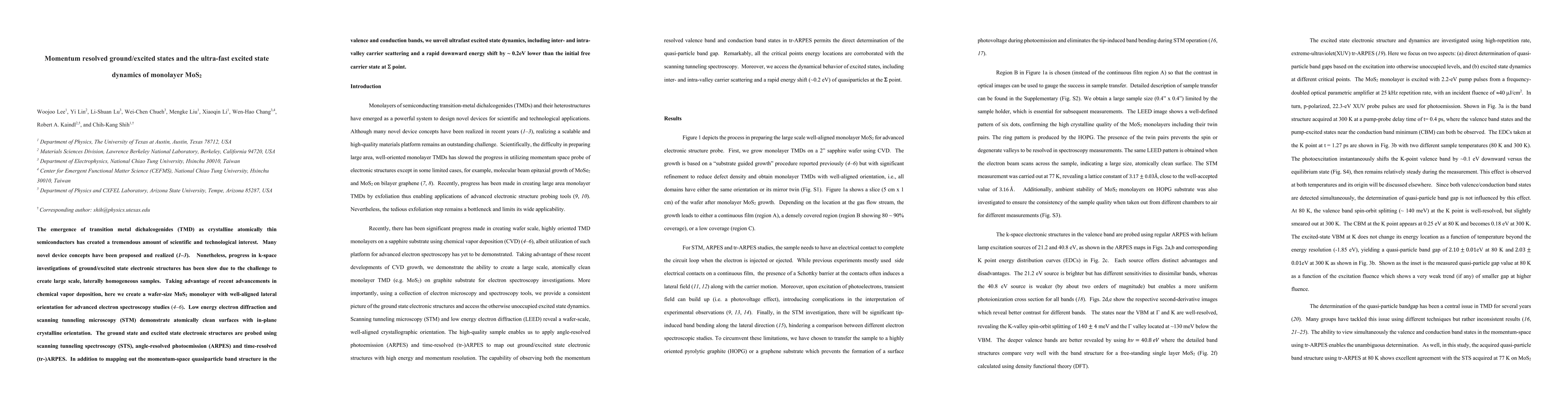 The emergence of transition metal dichalcogenides (TMD) as crystalline atomically thin semiconductors has created a tremendous amount of scientific and technological interest. Many novel device concepts have been proposed and realized (1-3). Nonetheless, progress in k-space investigations of ground/excited state electronic structures has been slow due to the challenge to create large scale, laterally homogeneous samples. Taking advantage of recent advancements in chemical vapor deposition, here we create a wafer-size MoS2 monolayer with well-aligned lateral orientation for advanced electron spectroscopy studies (4-6). Low energy electron diffraction and scanning tunneling microscopy (STM) demonstrate atomically clean surfaces with in-plane crystalline orientation. The ground state and excited state electronic structures are probed using scanning tunneling spectroscopy (STS), angle-resolved photoemission (ARPES) and time-resolved (tr-)ARPES. In addition to mapping out the momentum-space quasiparticle band structure in the valence and conduction bands, we unveil ultrafast excited state dynamics, including inter- and intra-valley carrier scattering and a rapid downward energy shift by ~ 0.2eV lower than the initial free carrier state at Sigma point.
