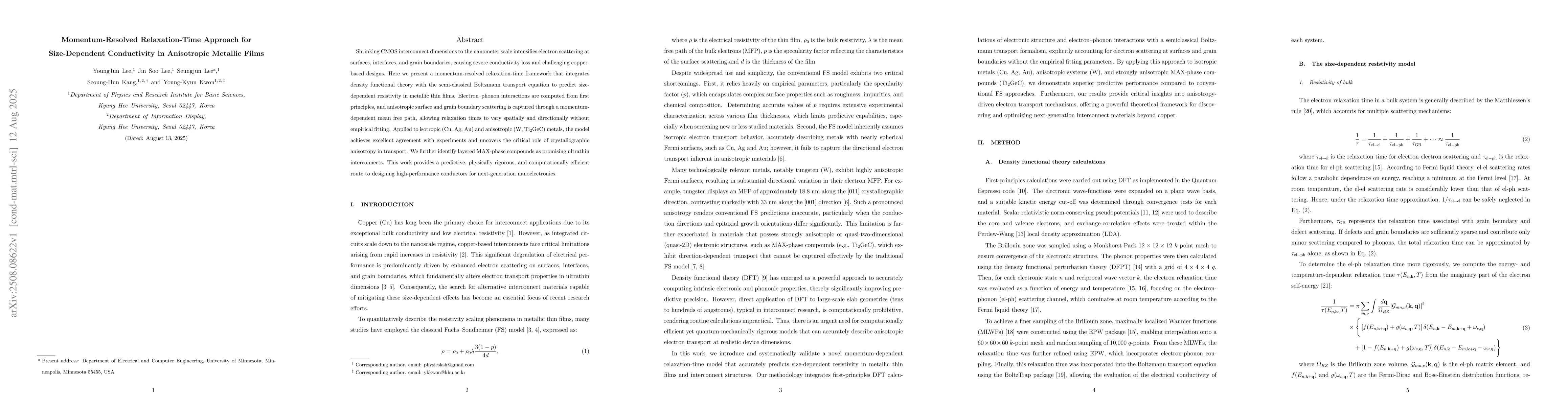 Shrinking CMOS interconnect dimensions to the nanometer scale intensifies electron scattering at surfaces, interfaces, and grain boundaries, causing severe conductivity loss and challenging copper-based designs. Here we present a momentum-resolved relaxation time framework that integrates density functional theory with the semiclassical Boltzmann transport equation to predict size-dependent resistivity in metallic thin films. Electron phonon interactions are computed from first principles, and anisotropic surface and grain boundary scattering is captured through a momentum dependent mean free path, allowing relaxation times to vary spatially and directionally without empirical fitting. Applied to isotropic (Cu, Ag, Au) and anisotropic (W, Ti$_2$GeC) metals, the model achieves excellent agreement with experiments and uncovers the critical role of crystallographic anisotropy in transport. We further identify layered MAX phase compounds as promising ultrathin interconnects. This work provides a predictive, physically rigorous, and computationally efficient route to designing high-performance conductors for next generation nanoelectronics.