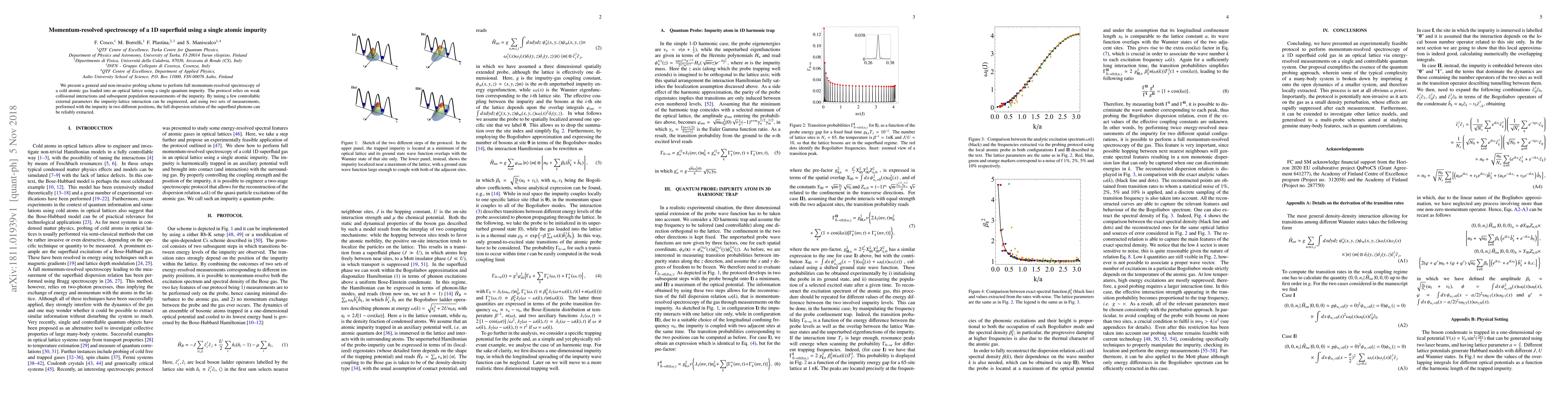 This research introduces a non-invasive method for momentum-resolved spectroscopy of a 1D superfluid using a single atomic impurity, relying on weak interactions and population measurements to extract the superfluid phonon dispersion relation. The technique involves tuning external parameters and performing measurements with the impurity in two different positions.