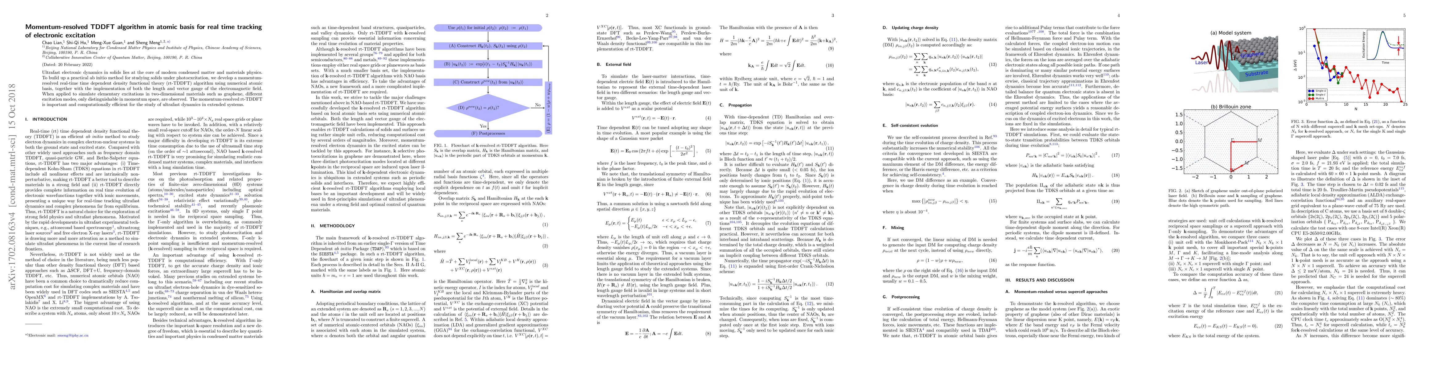 This paper develops a momentum-resolved real-time time-dependent density functional theory (rt-TDDFT) algorithm in atomic basis for studying ultrafast electronic dynamics in solids. The method is computationally efficient and reveals distinct excitation modes in two-dimensional materials like graphene, highlighting its importance for ultrafast dynamics research.