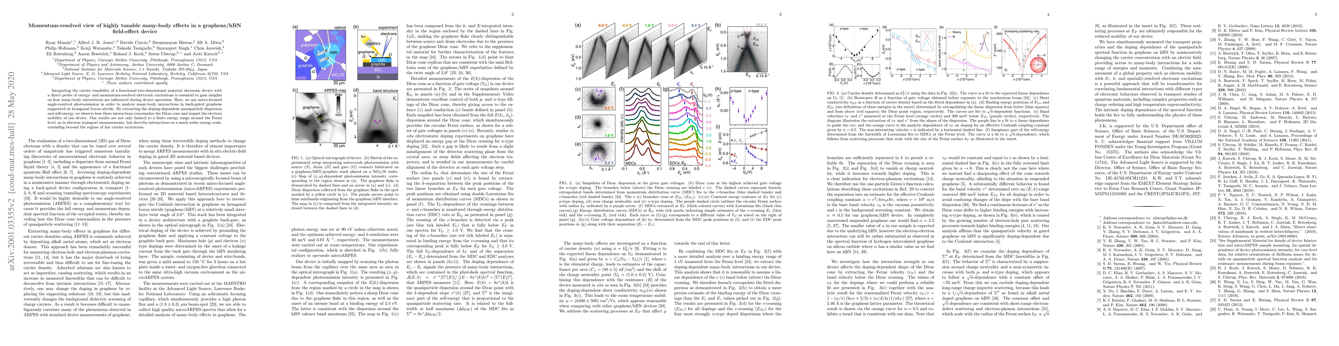 Integrating the carrier tunability of a functional two-dimensional material electronic device with a direct probe of energy- and momentum-resolved electronic excitations is essential to gain insights on how many-body interactions are influenced during device operation. Here, we use micro-focused angle-resolved photoemission in order to analyze many-body interactions in back-gated graphene supported on hexagonal boron nitride. By extracting the doping-dependent quasiparticle dispersion and self-energy, we observe how these interactions renormalize the Dirac cone and impact the electron mobility of our device. Our results are not only limited to a finite energy range around the Fermi level, as in electron transport measurements, but describe interactions on a much wider energy scale, extending beyond the regime of hot carrier excitations.
