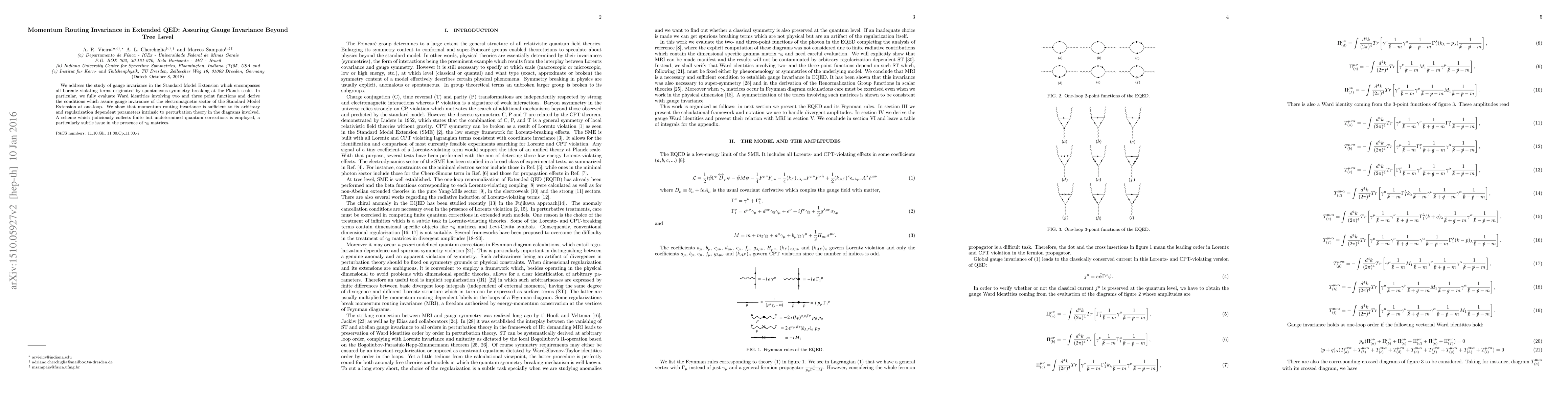This paper investigates gauge invariance in the Standard Model Extension, focusing on Lorentz-violating terms from spontaneous symmetry breaking. It evaluates Ward identities at one-loop and demonstrates that momentum routing invariance ensures gauge invariance in the electromagnetic sector, resolving regularization-dependent parameters.