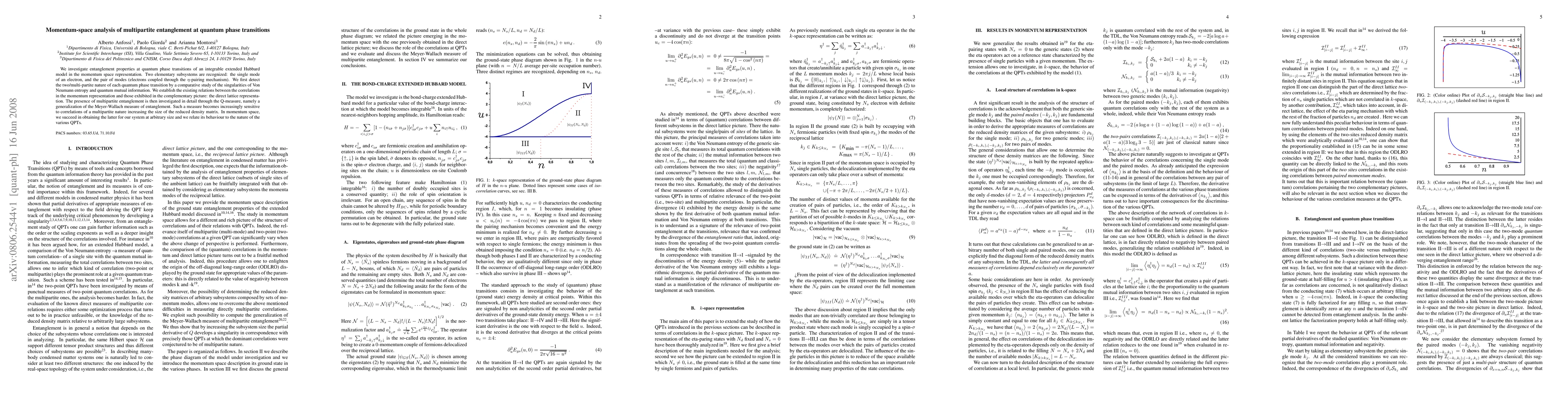 This paper examines entanglement properties in an extended Hubbard model at quantum phase transitions, focusing on multipartite entanglement in momentum space. It uses the Q-measure to detect and analyze multipartite correlations, revealing their sensitivity to the nature of quantum phase transitions.