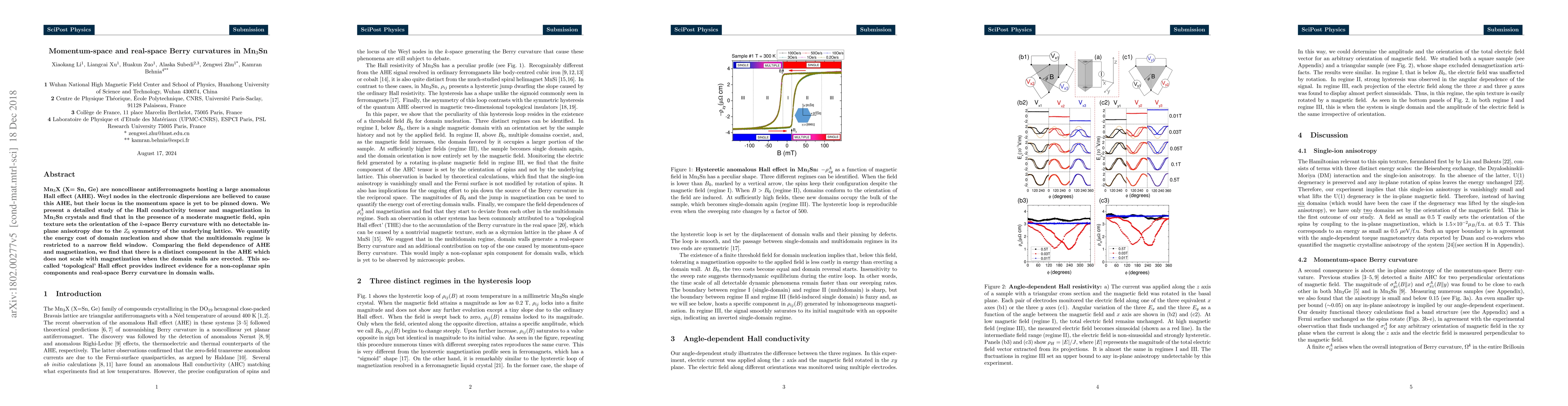 This paper investigates the momentum-space and real-space Berry curvatures in Mn$_3$Sn, revealing a spin texture that orients the $k$-space Berry curvature without in-plane anisotropy due to $Z_6$ symmetry. It finds a distinct topological Hall effect component not scaling with magnetization, indicating non-coplanar spin components and real-space Berry curvature in domain walls.