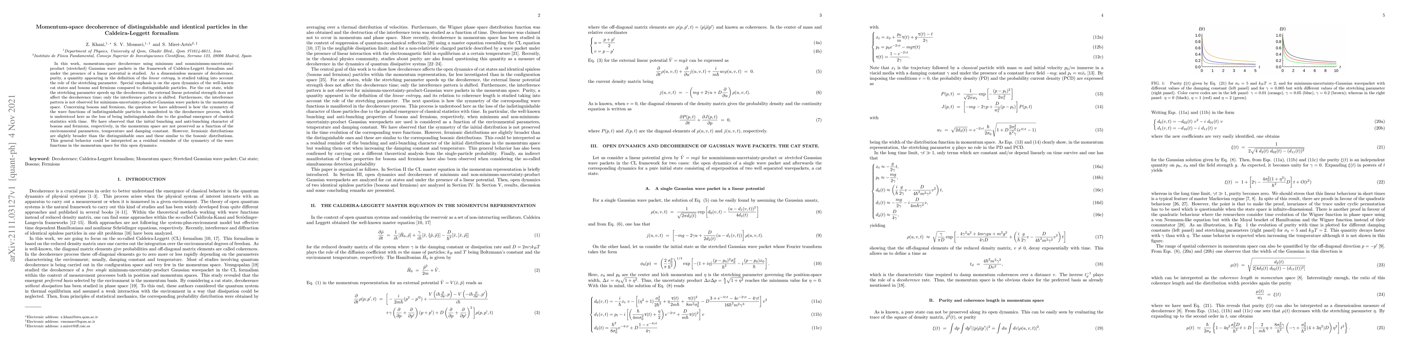 This study explores how particles behave when interacting with their environment in a quantum system, showing that momentum-space decoherence affects both distinguishable and identical particles differently, while the symmetry of indistinguishable particles is partially preserved.