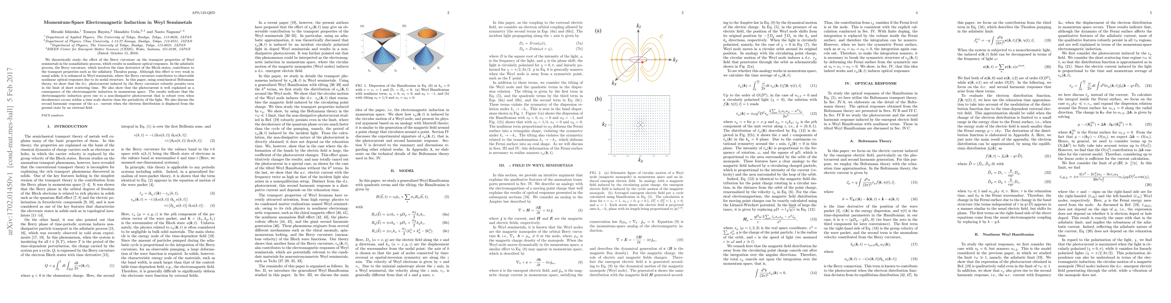 This paper investigates the impact of Berry curvature on transport properties in Weyl semimetals, showing that it enhances nonlinear optical responses and induces a robust direct photocurrent due to momentum-space electromagnetic induction, which remains effective even under short scattering times. Additionally, it discusses the second harmonic response of alternating current when the electron distribution is perturbed by an external field.