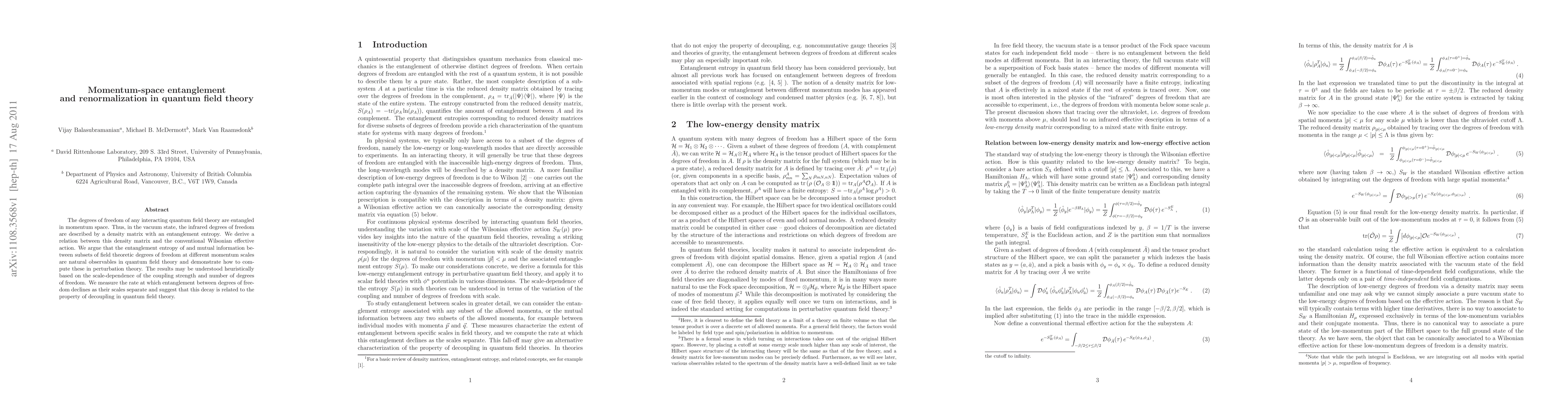 The degrees of freedom of any interacting quantum field theory are entangled in momentum space. Thus, in the vacuum state, the infrared degrees of freedom are described by a density matrix with an entanglement entropy. We derive a relation between this density matrix and the conventional Wilsonian effective action. We argue that the entanglement entropy of and mutual information between subsets of field theoretic degrees of freedom at different momentum scales are natural observables in quantum field theory and demonstrate how to compute these in perturbation theory. The results may be understood heuristically based on the scale-dependence of the coupling strength and number of degrees of freedom. We measure the rate at which entanglement between degrees of freedom declines as their scales separate and suggest that this decay is related to the property of decoupling in quantum field theory.