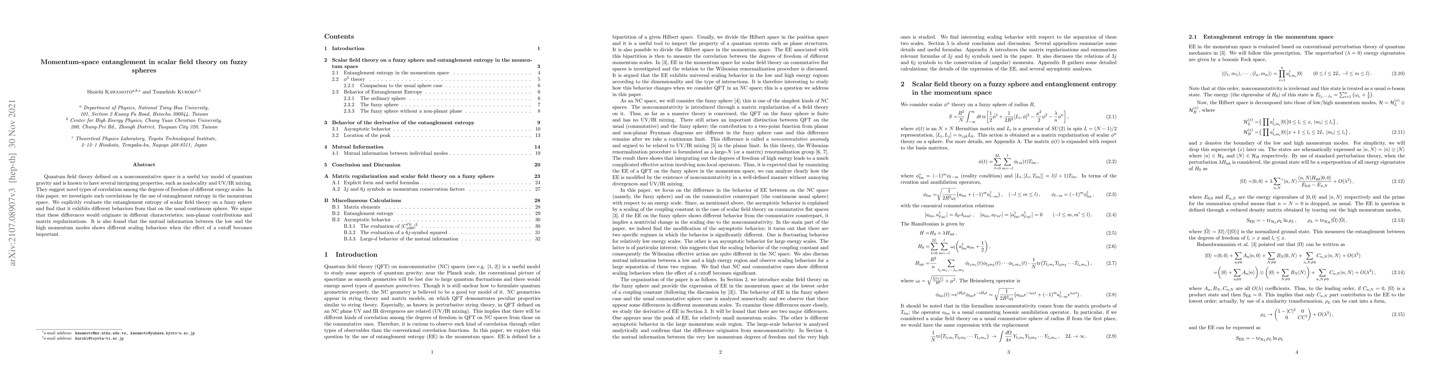 This paper examines entanglement entropy in scalar field theory on a fuzzy sphere, revealing distinct behaviors compared to continuous spheres due to non-planar contributions and matrix regularization, and shows different scaling of mutual information under cutoff effects.