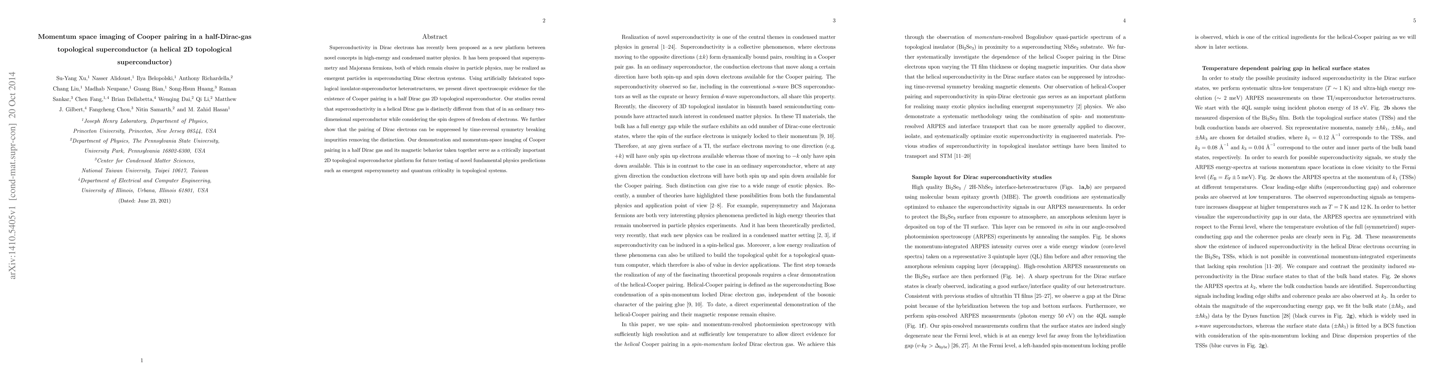 Superconductivity in Dirac electrons has recently been proposed as a new platform between novel concepts in high-energy and condensed matter physics. It has been proposed that supersymmetry and exotic quasiparticles, both of which remain elusive in particle physics, may be realized as emergent particles in superconducting Dirac electron systems. Using artificially fabricated topological insulator-superconductor heterostructures, we present direct spectroscopic evidence for the existence of Cooper pairing in a half Dirac gas 2D topological superconductor. Our studies reveal that superconductivity in a helical Dirac gas is distinctly different from that of in an ordinary two-dimensional superconductor while considering the spin degrees of freedom of electrons. We further show that the pairing of Dirac electrons can be suppressed by time-reversal symmetry breaking impurities removing the distinction. Our demonstration and momentum-space imaging of Cooper pairing in a half Dirac gas and its magnetic behavior taken together serve as a critically important 2D topological superconductor platform for future testing of novel fundamental physics predictions such as emergent supersymmetry and quantum criticality in topological systems.
