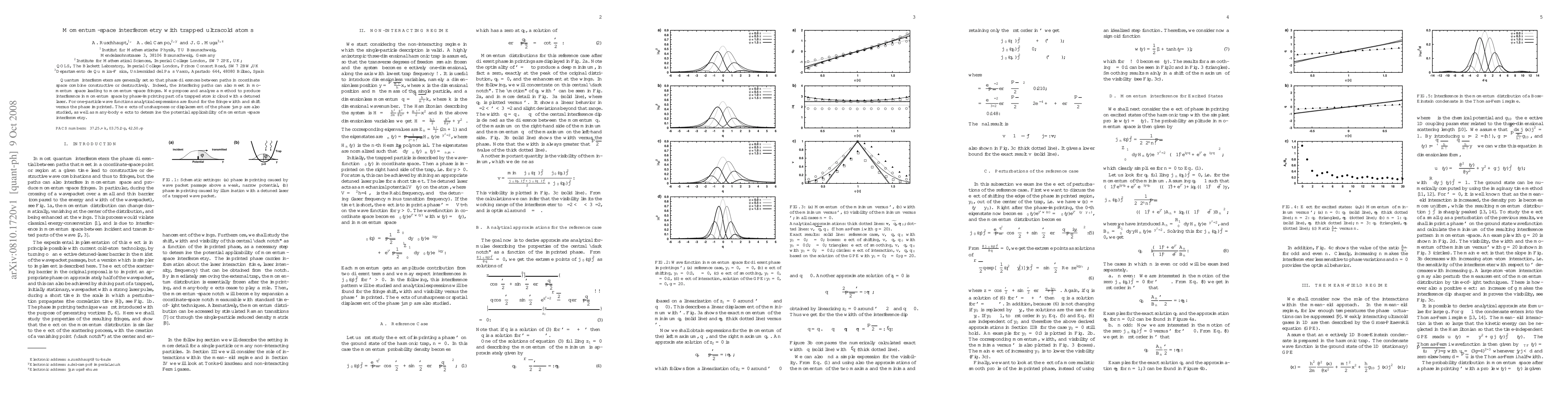The paper presents analytical expressions for fringe width, shift, and visibility in momentum space for one-particle wave functions, along with an analysis of unsharpness, displacement, and many-body effects in phase-imprinted trapped ultracold atoms.