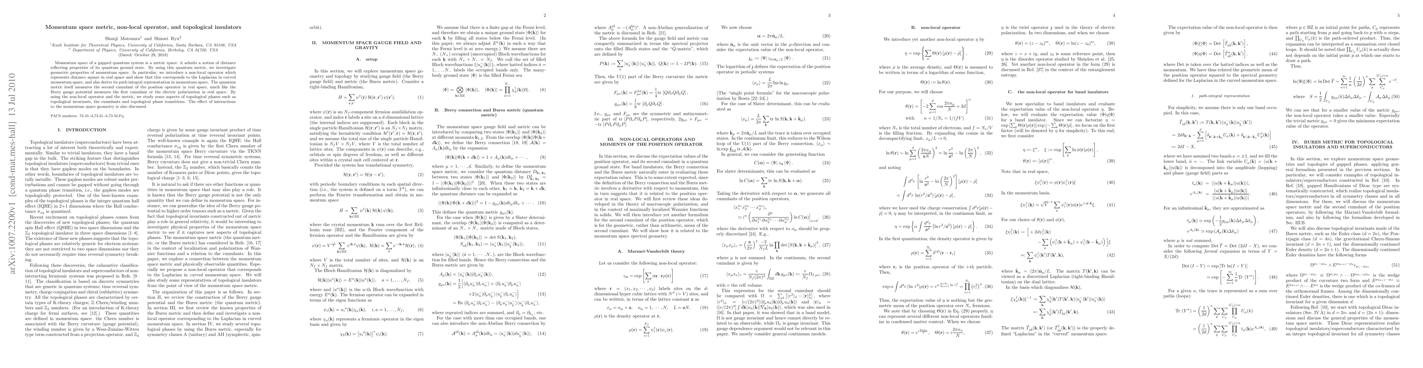 This paper explores the geometric properties of the momentum space in a gapped quantum system using a quantum metric, introducing a non-local operator that represents distance in real space. It connects the non-local operator to the Laplacian in curved momentum space and discusses its implications for topological insulators and phase transitions.