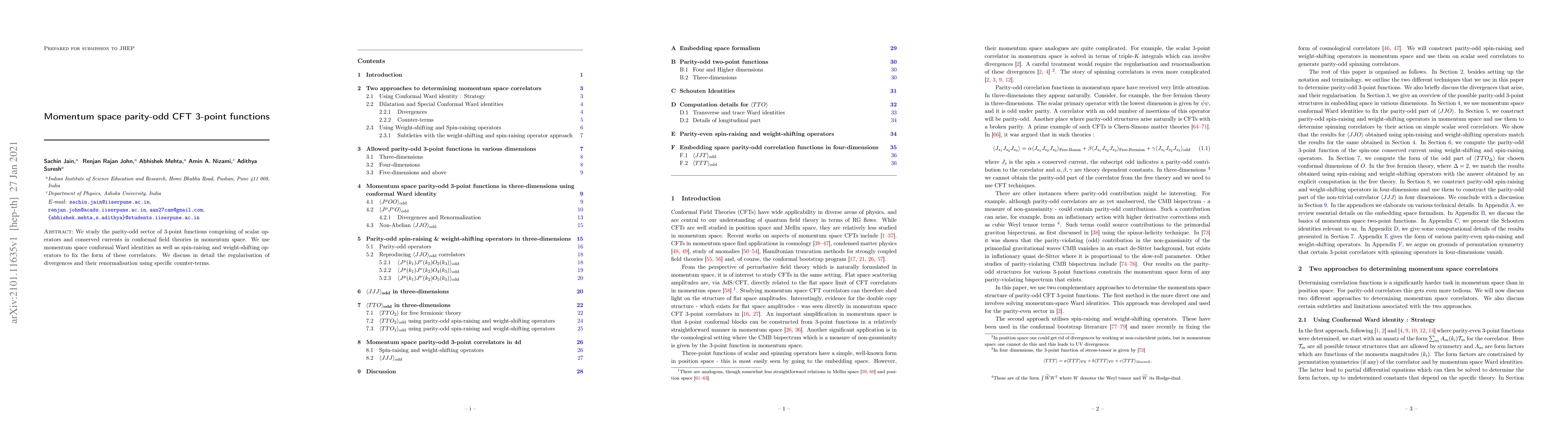 This paper explores the parity-odd 3-point functions in conformal field theories involving scalars and conserved currents in momentum space, utilizing conformal Ward identities and operators to determine their form. It also addresses the regularization and renormalization of divergences through specific counter-terms.