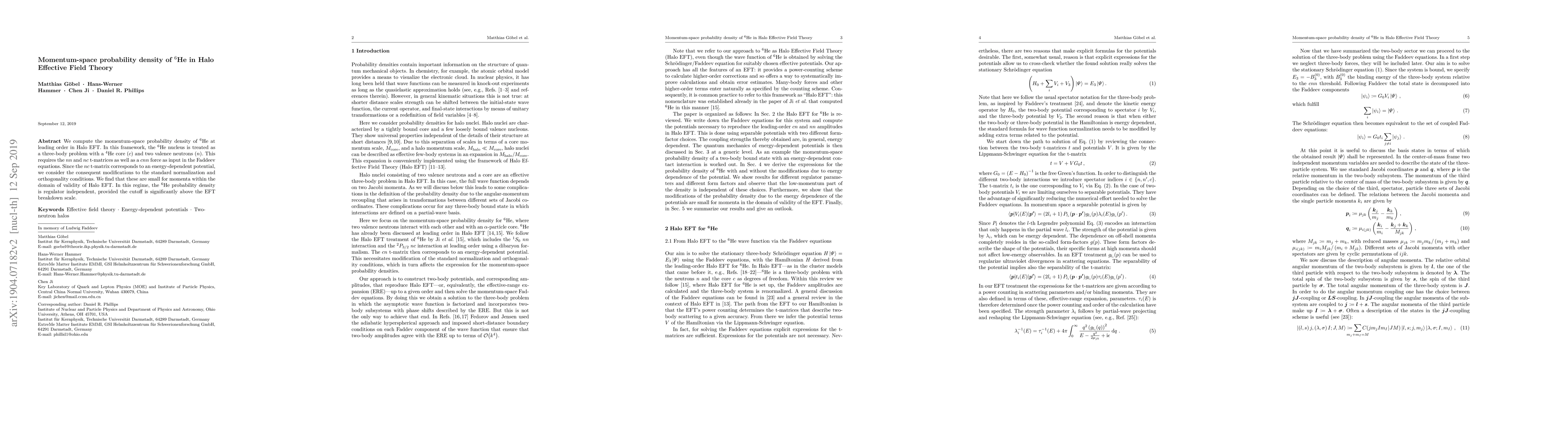 We compute the momentum-space probability density of ${}^6$He at leading order in Halo EFT. In this framework, the ${}^6$He nucleus is treated as a three-body problem with a ${}^4$He core ($c$) and two valence neutrons ($n$). This requires the $nn$ and $nc$ t-matrices as well as a $cnn$ force as input in the Faddeev equations. Since the $nc$ t-matrix corresponds to an energy-dependent potential, we consider the consequent modifications to the standard normalization and orthogonality conditions. We find that these are small for momenta within the domain of validity of Halo EFT. In this regime, the ${}^6$He probability density is regulator independent, provided the cutoff is significantly above the EFT breakdown scale.