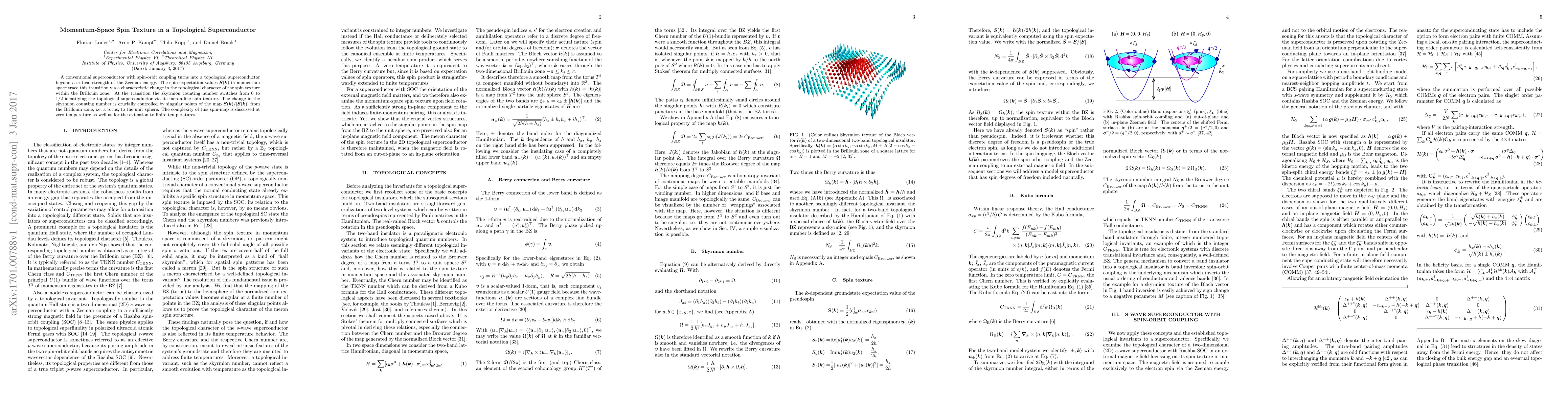 This paper investigates how a conventional superconductor transforms into a topological superconductor through spin-orbit coupling, characterized by a shift in spin texture in momentum space. The transition is marked by a change in the skyrmion counting number from 0 to 1/2, indicating a meron-like spin texture and a topological phase transition.