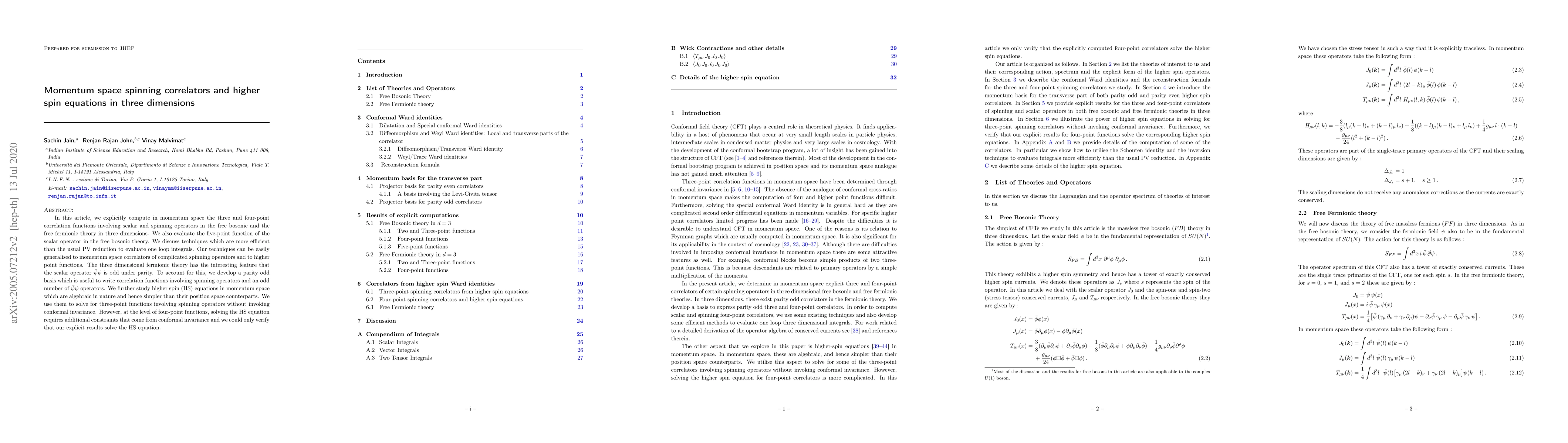 In this article, we explicitly compute in momentum space the three and four-point correlation functions involving scalar and spinning operators in the free bosonic and the free fermionic theory in three dimensions. We also evaluate the five-point function of the scalar operator in the free bosonic theory. We discuss techniques which are more efficient than the usual PV reduction to evaluate one loop integrals. Our techniques can be easily generalised to momentum space correlators of complicated spinning operators and to higher point functions. The three dimensional fermionic theory has the interesting feature that the scalar operator $\bar\psi\psi$ is odd under parity. To account for this, we develop a parity odd basis which is useful to write correlation functions involving spinning operators and an odd number of $\bar\psi\psi$ operators. We further study higher spin (HS) equations in momentum space which are algebraic in nature and hence simpler than their position space counterparts. We use them to solve for three-point functions involving spinning operators without invoking conformal invariance. However, at the level of four-point functions, solving the HS equation requires additional constraints that come from conformal invariance and we could only verify that our explicit results solve the HS equation.