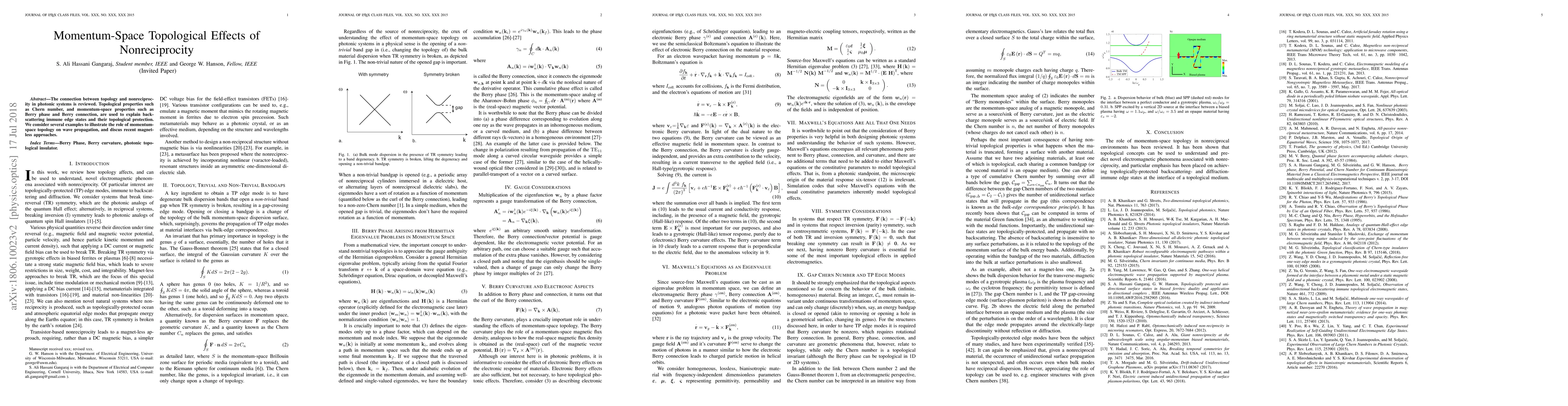 The connection between topology and nonreciprocity in photonic systems is reviewed. Topological properties such as Chern number, and momentum-space properties such as Berry phase and Berry connection, are used to explain back-scattering immune edge states and their topological protection. We consider several examples to illustrate the role of momentum-space topology on wave propagation, and discus recent magnet-less approaches.