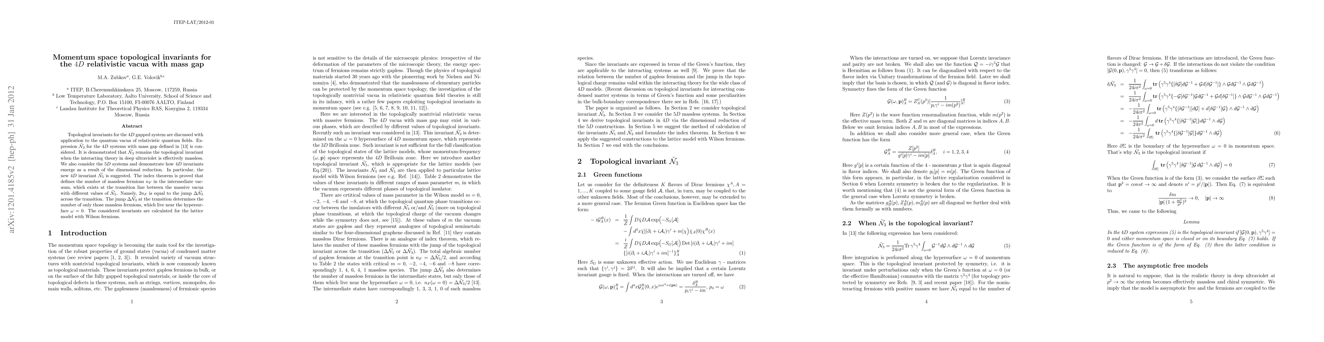 Topological invariants for the 4D gapped system are discussed with application to the quantum vacua of relativistic quantum fields. Expression $\tilde{\cal N}_3$ for the 4D systems with mass gap defined in \cite{Volovik2010} is considered. It is demonstrated that $\tilde{\cal N}_3$ remains the topological invariant when the interacting theory in deep ultraviolet is effectively massless. We also consider the 5D systems and demonstrate how 4D invariants emerge as a result of the dimensional reduction. In particular, the new 4D invariant $\tilde{\cal N}_5$ is suggested. The index theorem is proved that defines the number of massless fermions $n_F$ in the intermediate vacuum, which exists at the transition line between the massive vacua with different values of $\tilde{\cal N}_5$. Namely, $ 2 n_F$ is equal to the jump $\Delta\tilde{\cal N}_5$ across the transition. The jump $\Delta\tilde{\cal N}_3$ at the transition determines the number of only those massless fermions, which live near the hypersurface $\omega=0$. The considered invariants are calculated for the lattice model with Wilson fermions.