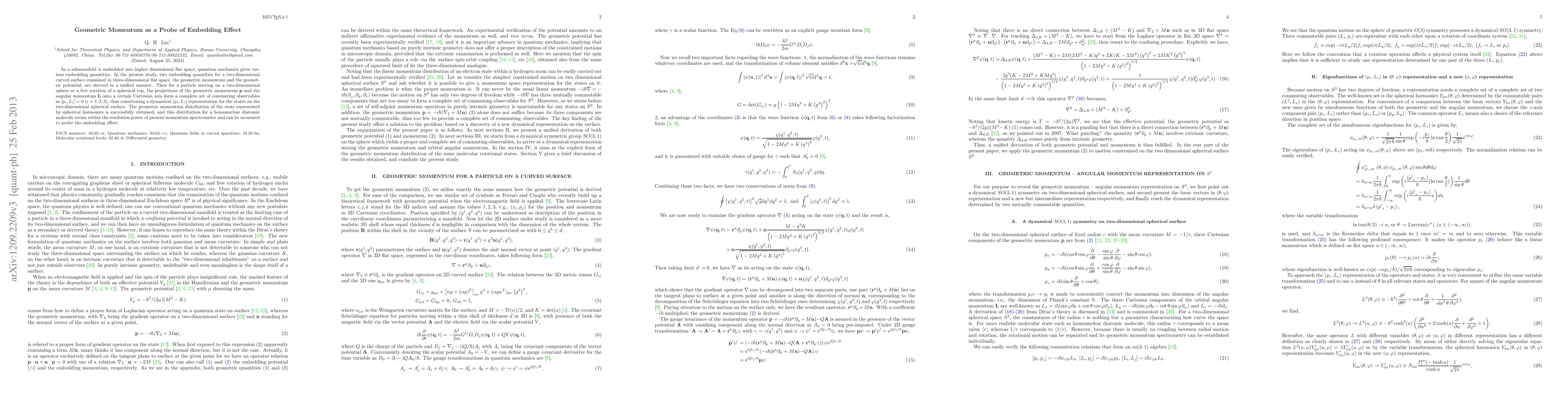 As a submanifold is embedded into higher dimensional flat space, quantum mechanics gives various embedding quantities, e.g., the geometric momentum and geometric potential, etc. For a particle moving on a two-dimensional sphere or a free rotation of a spherical top, the projections of the geometric momentum p and the angular momentum L onto a certain Cartesian axis form a complete set of commuting observables as [p_{i},L_{i}]=0 (i=1,2,3). We have therefore a (p_{i},L_{i}) representation for the states on the two-dimensional spherical surface. The geometric momentum distribution of the ground states for a freely rotating rigid rotor seems within the resolution power of present momentum spectrometer and can be measured to probe the embedding effect.