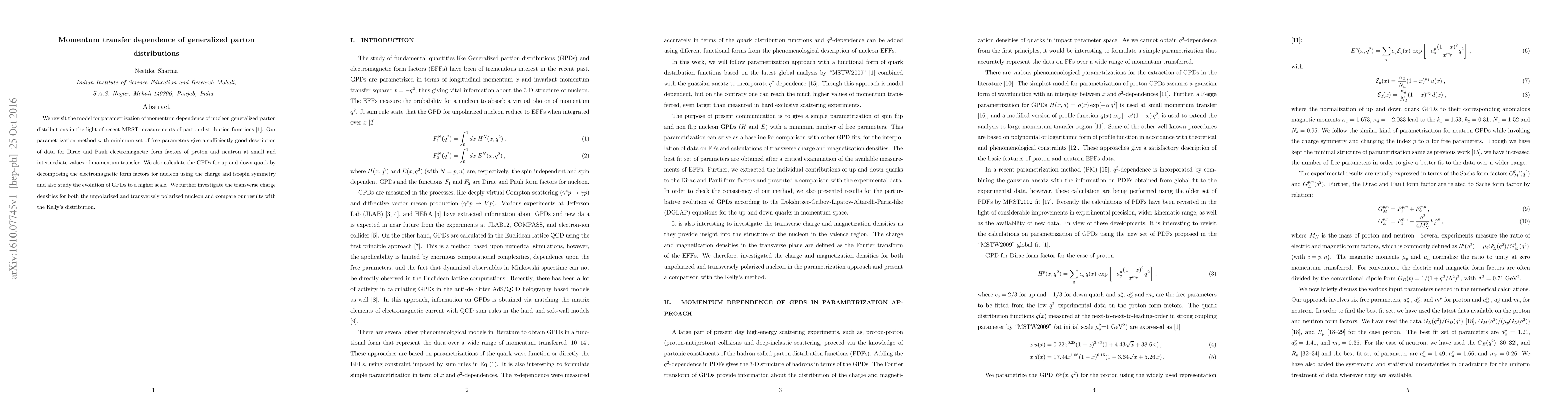 We revisit the model for parametrization of momentum dependence of nucleon generalized parton distributions in the light of recent MRST measurements of parton distribution functions. Our parametrization method with minimum set of free parameters give a sufficiently good description of data for Dirac and Pauli electromagnetic form factors of proton and neutron at small and intermediate values of momentum transfer. We also calculate the GPDs for up and down quark by decomposing the electromagnetic form factors for nucleon using the charge and isospin symmetry and also study the evolution of GPDs to a higher scale. We further investigate the transverse charge densities for both the unpolarized and transversely polarized nucleon and compare our results with the Kelly's distribution.